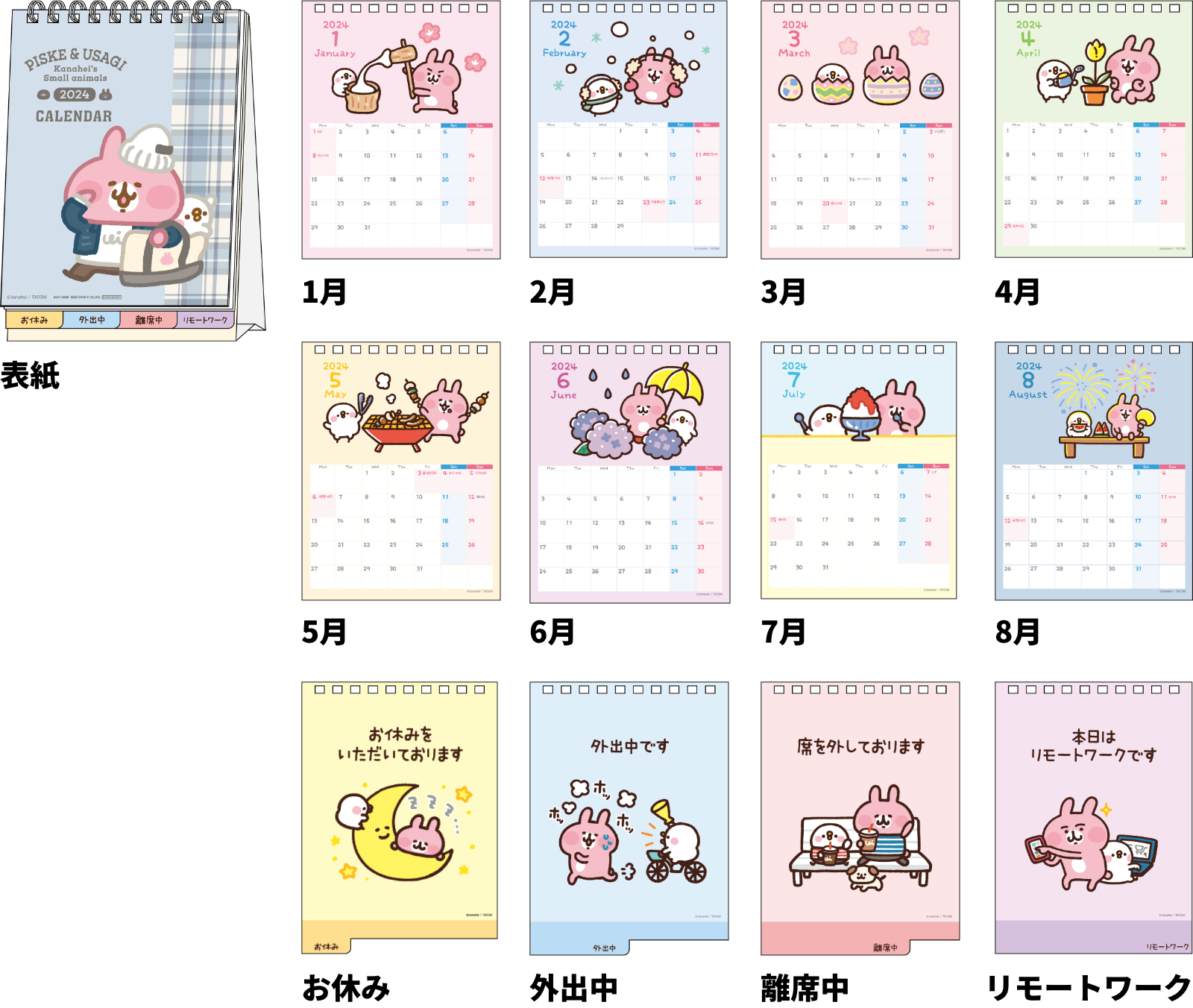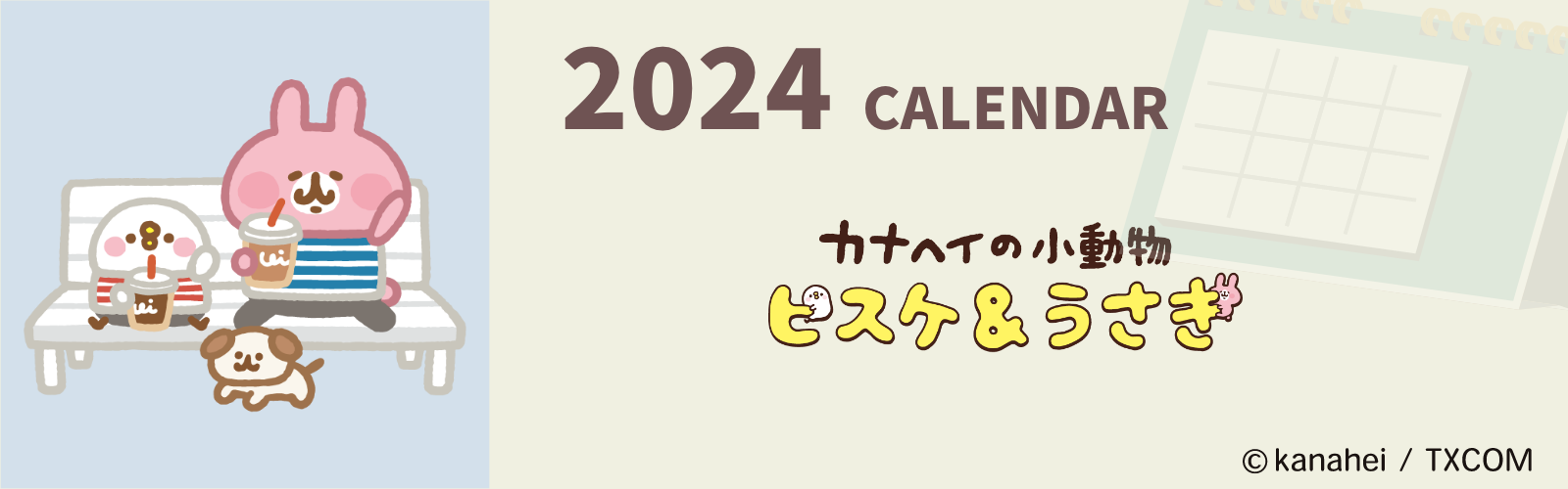 メッセージに合わせたピスケとうさぎのポーズがかわいいカレンダーです。
