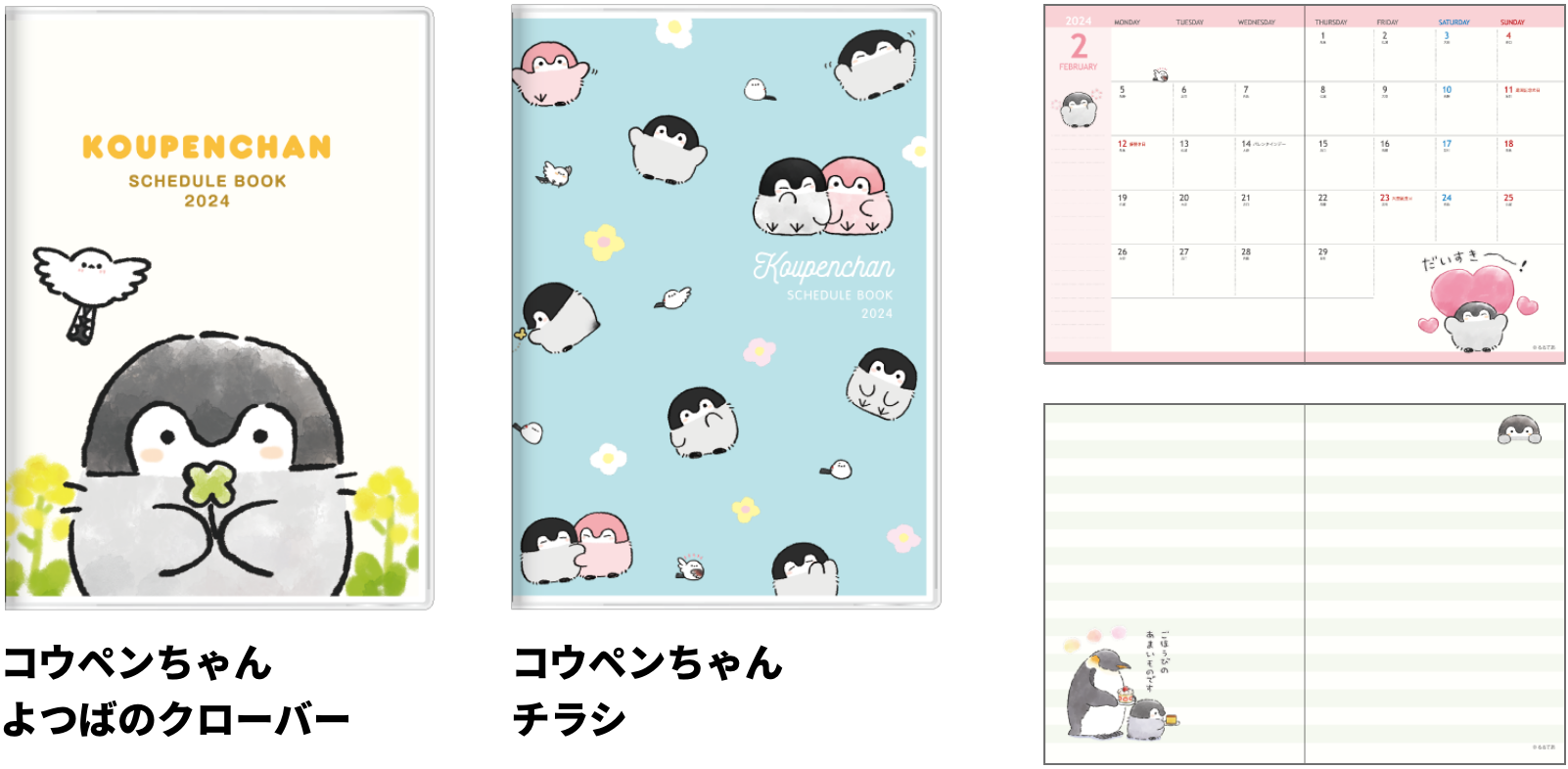 手帳 月間A6 ¥1,045-(消費税込) 持ち運びやすい定番のA6サイズ! 【本体サイズ】W105×H152×D5mm 【本体重量】73g【材質】表紙:PVC・紙/本文:紙【表紙仕様】エンボス紙【内容】 カバー:ペンホルダー付/本文:64ページ/カレンダー・年間プラン・月間スケジュール(2023年10月~2024年12月・六曜入)・メモ・世界地図・路線図 【パッケージ】 個袋入【生産国】日本【JANコード】よつばのクローバー:4901770715674 チラシ:4901770715681