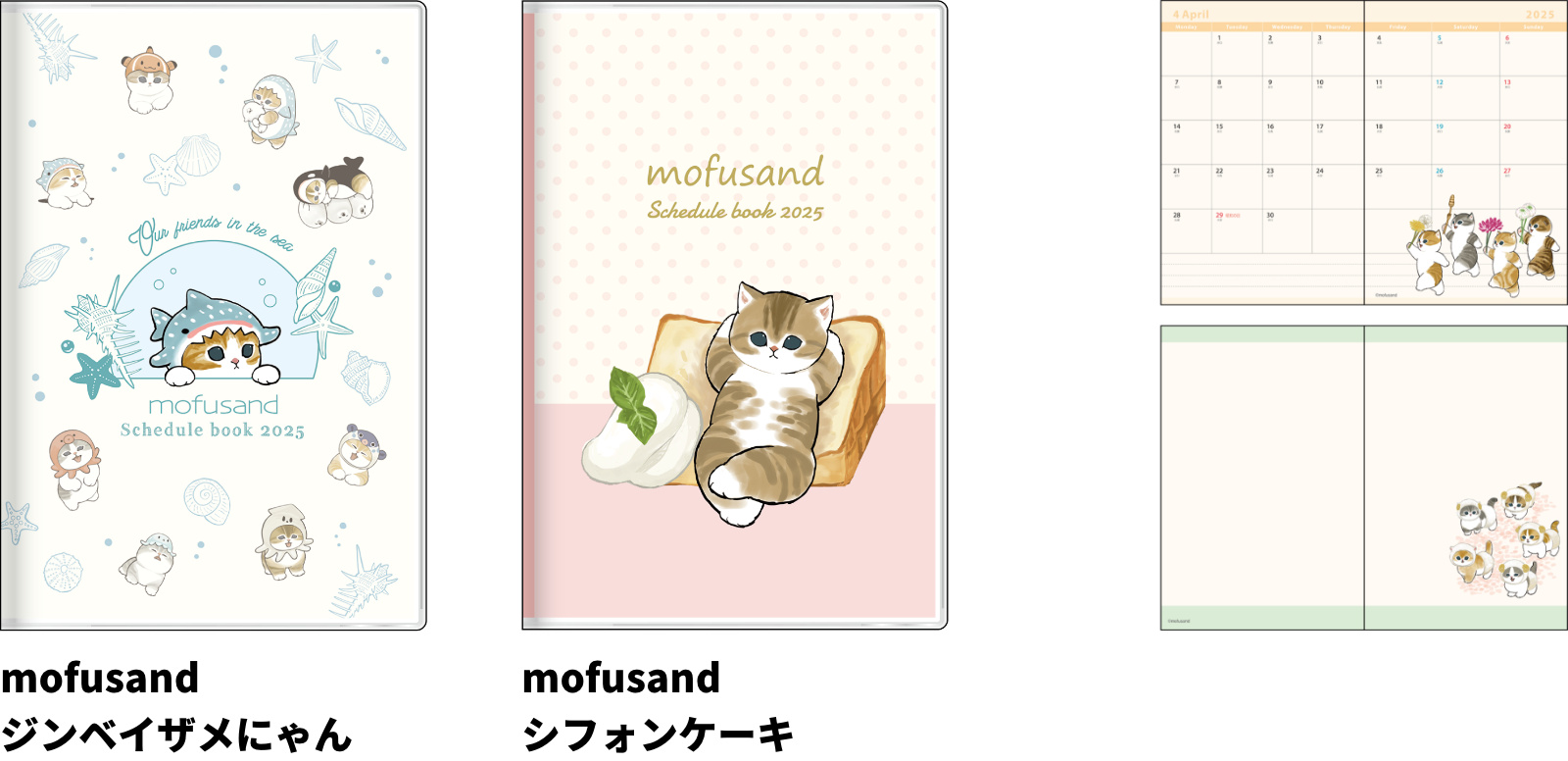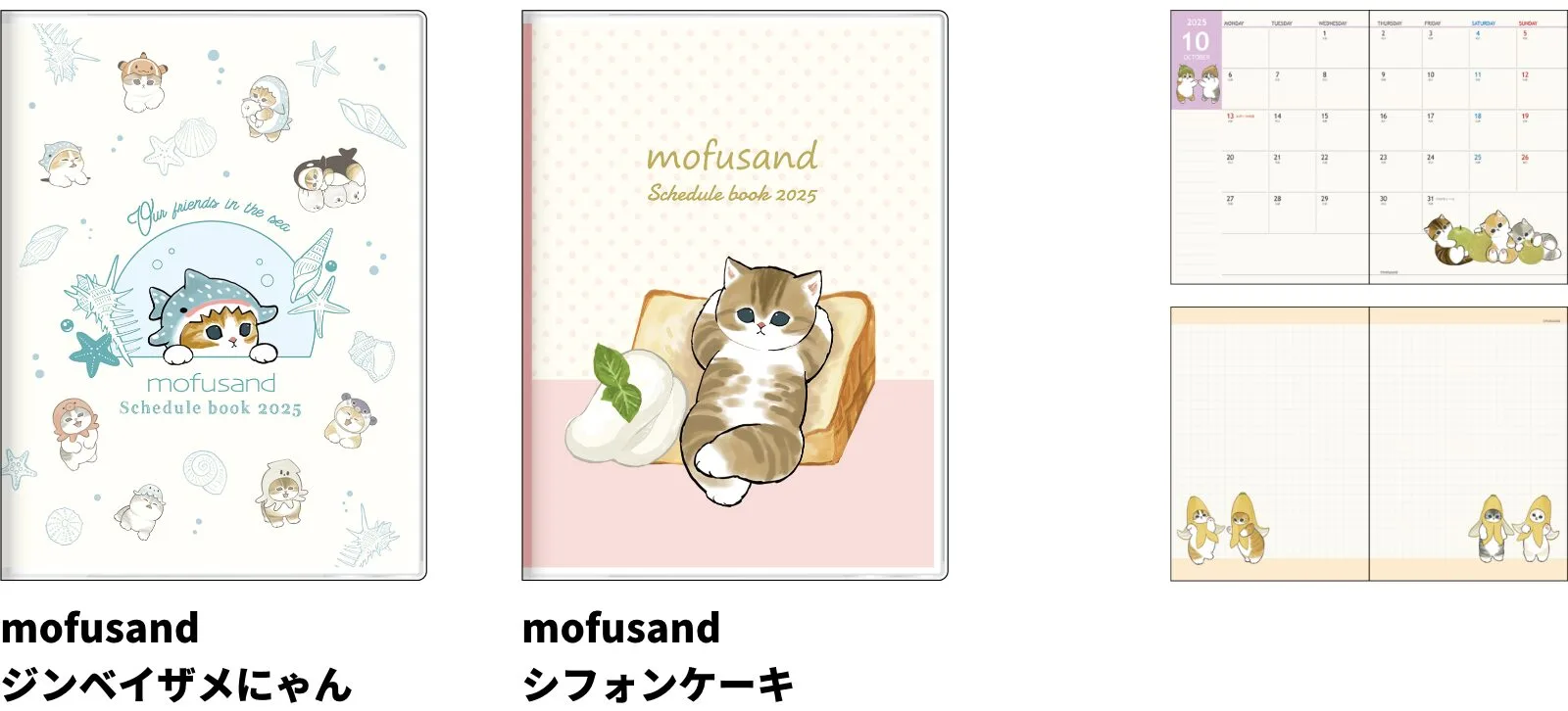 【本体サイズ】W89×H134×D4mm【本体重量】55g【材質】表紙:PVC・紙/本文:紙 【表紙仕様】パール紙【内容】本文:64ページ/カレンダー・年間プラン・月間スケジュール(2024年10月~2025年12月・六曜入)・メモ・路線図【パッケージ】個袋入【生産国】日本【JANコード】mofusand ジンベイザメにゃん:4901770760339 mofusand シフォンケーキ:4901770760346