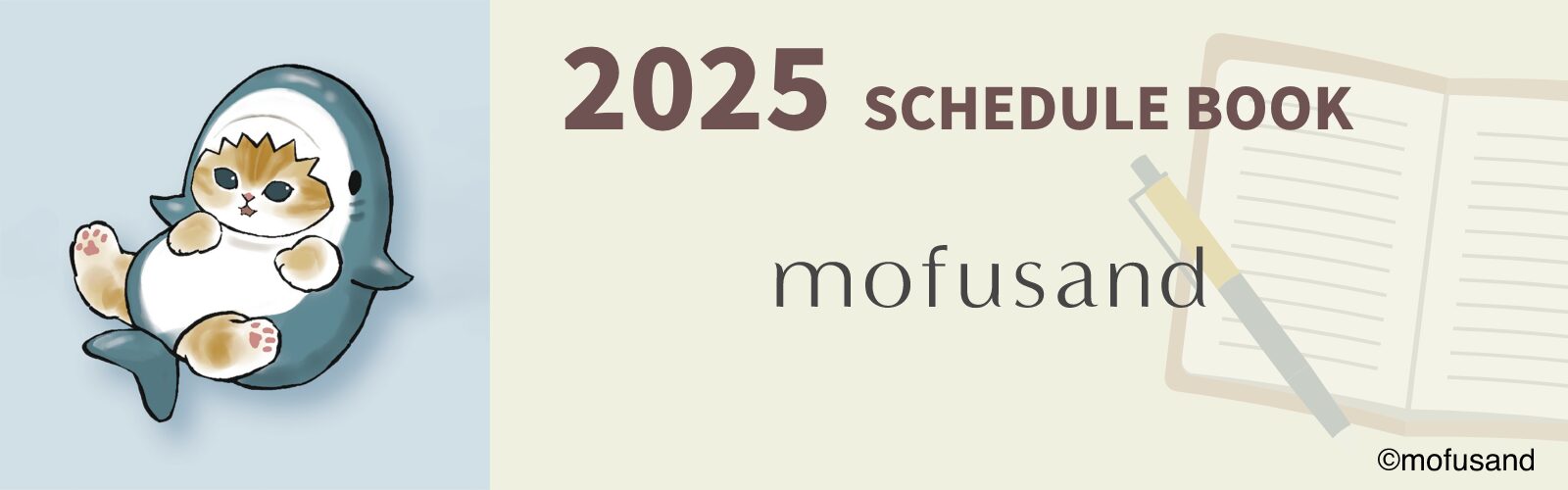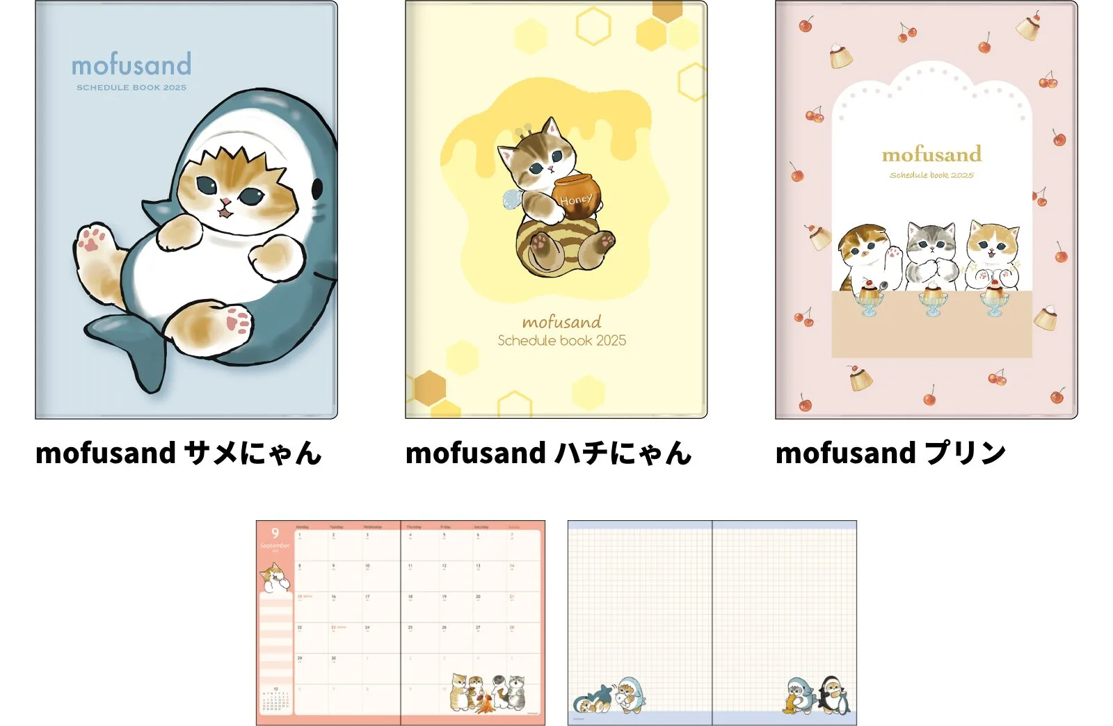 【本体サイズ】W132×H188×D6mm【本体重量】130g【材質】表紙:PVC/本文:紙【表紙仕様】梨地フルカラーカバー【内容】カバー:ペンホルダー付/本文:64ページ/カレンダー・年間プラン・月間スケジュール(2024年10月~2025年12月・六曜入)・メモ・路線図【パッケージ】個袋入【生産国】日本【JANコード】mofusand サメにゃん:4901770749853 mofusand ハチにゃん:4901770749860 mofusand プリン:4901770749877
