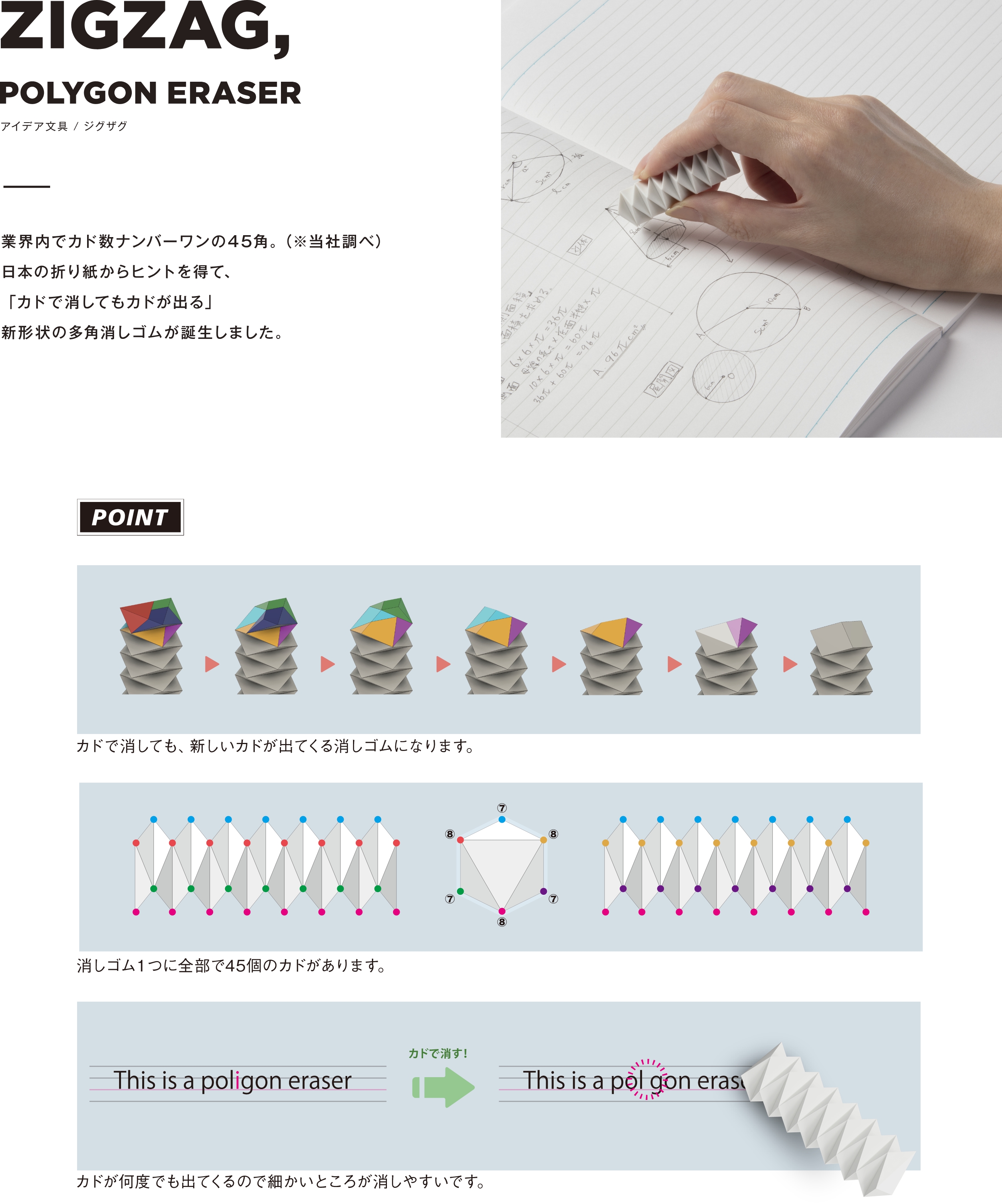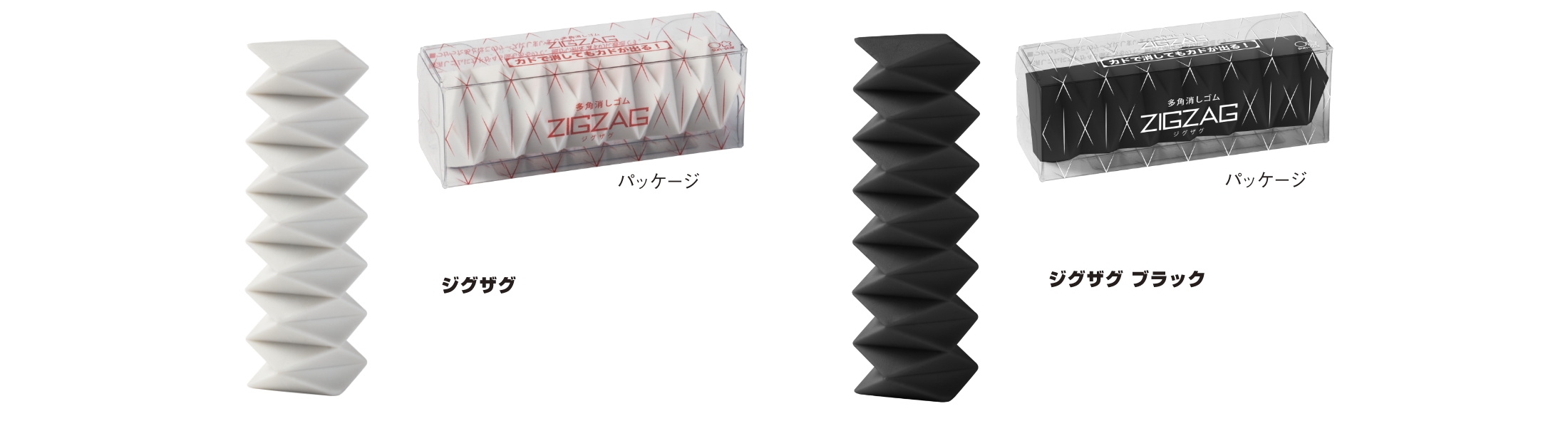 多角消しゴム ZIGZAG(ジグザグ) ¥220-(消費税込) カドで消してもカドが出る。いつまでもカドで消せる喜びを 【本体サイズ】W50×H18×D16mm 【本体重量】10g【材質】SBS 【パッケージ】PETケース【パッケージ入サイズ】W50×H18×D16mm【パッケージ入重量】10g【生産国】中国【JANコード】ジグザグ:4901770634845 ジグザグ ブラック:4901770667836