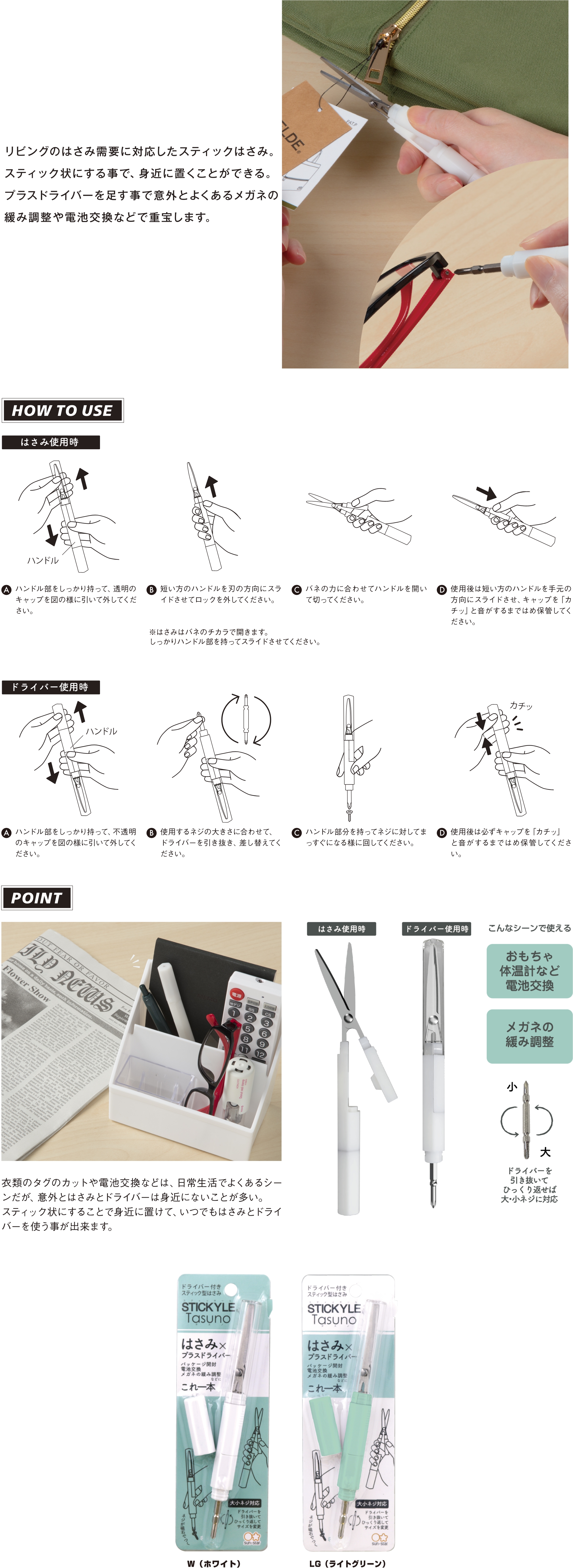 【本体サイズ】W14×H154×D13mm 【本体重量】25g【材質】キャップ・ハンドル:ABS / ブレード・ドライバー:ステンレス 【刃渡り】30mm 【パッケージ】ヘッダー付ブリスター 【パッケージ入サイズ】W60×H175×D16mm【パッケージ入重量】34g 【生産国】中国 【JANコード】W(ホワイト):4901770637853 LG(ライトグリーン):4901770637860