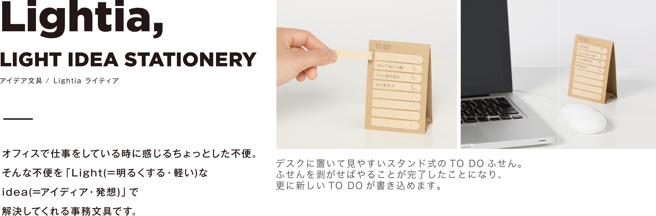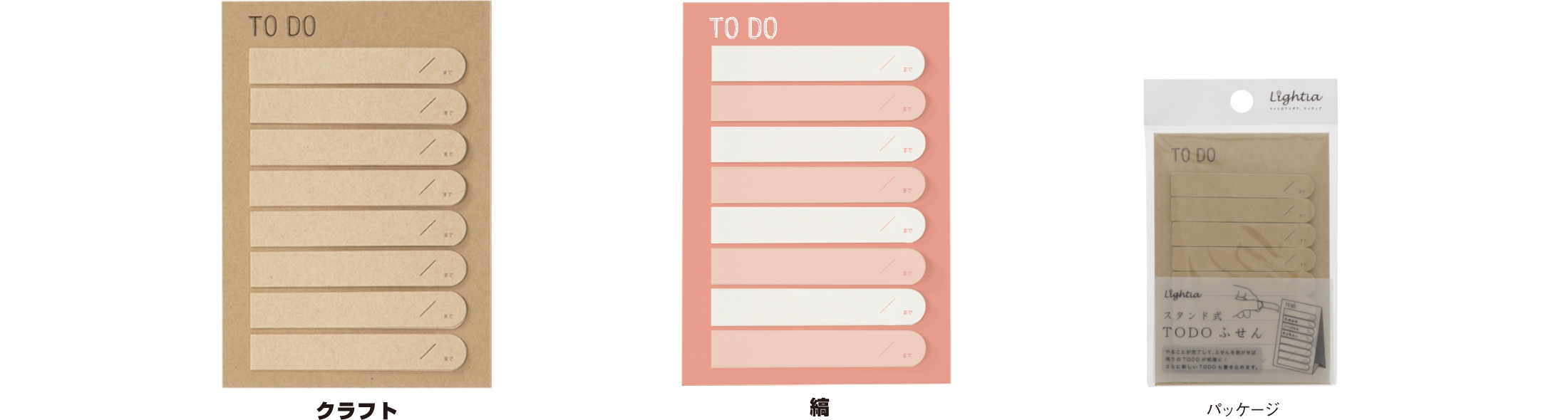 Lightia(ライティア)TO DOふせん ¥495-(消費税込) デスクに置いて見やすいスタンド式のTO DOふせん。 【本体サイズ】W75×H110×D7mm【本体重量】10g 【材質】紙 【内容】付箋160枚【パッケージ】ヘッダー付OP袋【パッケージ入サイズ】W80×H140×D10mm【パッケージ入重量】15g 【生産国】日本【JANコード】クラフト:4901770531359 縞:4901770531366
