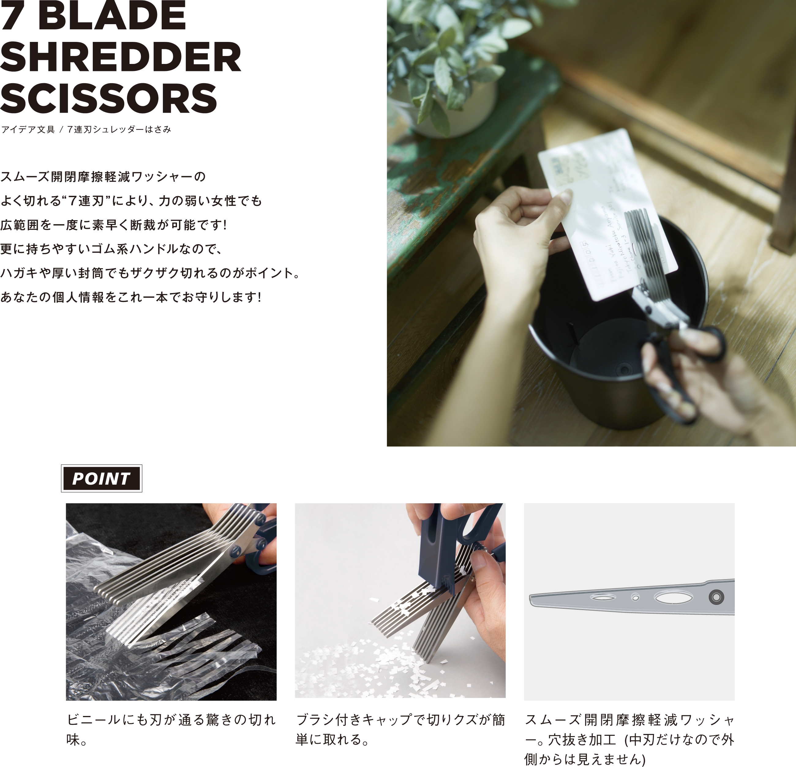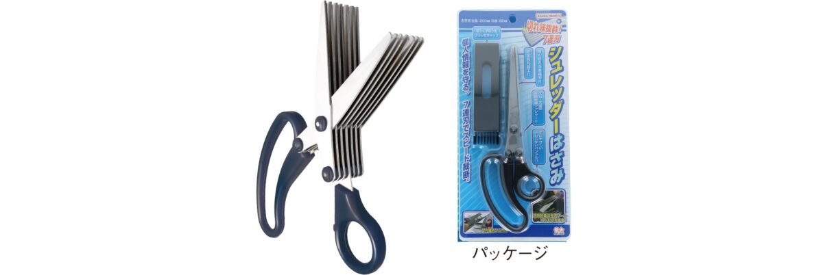 7連刃シュレッダーはさみ200mm ¥1,870-(消費税込) 個人情報を守る。7連刃でスピード裁断。 【本体サイズ】W69×H200×D29mm【本体重量】161g【材質】ブレード:ステンレス / ハンドル:R-LDPE /ワッシャー:POM / キャップ:R-ABS【刃渡り】82mm 【パッケージ】ヘッダー付ブリスター【パッケージ入サイズ】W122×H255×D32mm【パッケージ入重量】195g【生産国】中国【JANコード】4901770224923