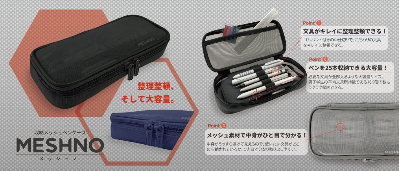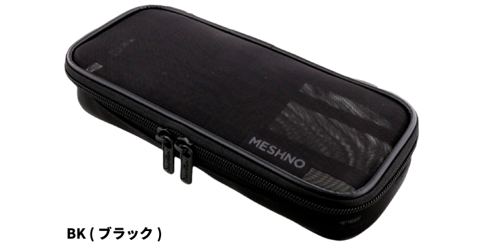 収納メッシュペンケース MESHNO(メッシュノ) ¥1,540-(消費税込) 【本体サイズ】W210×H90×D40mm 【本体重量】75g 【材質】ポリエステル・PVC 【パッケージ】なし(タグ・ループ付) 【生産国】中国【JANコード】BK:4901770690698
