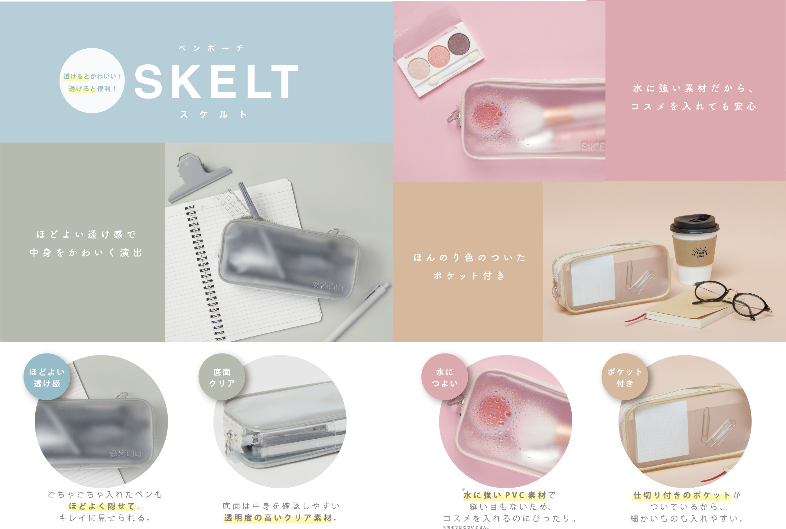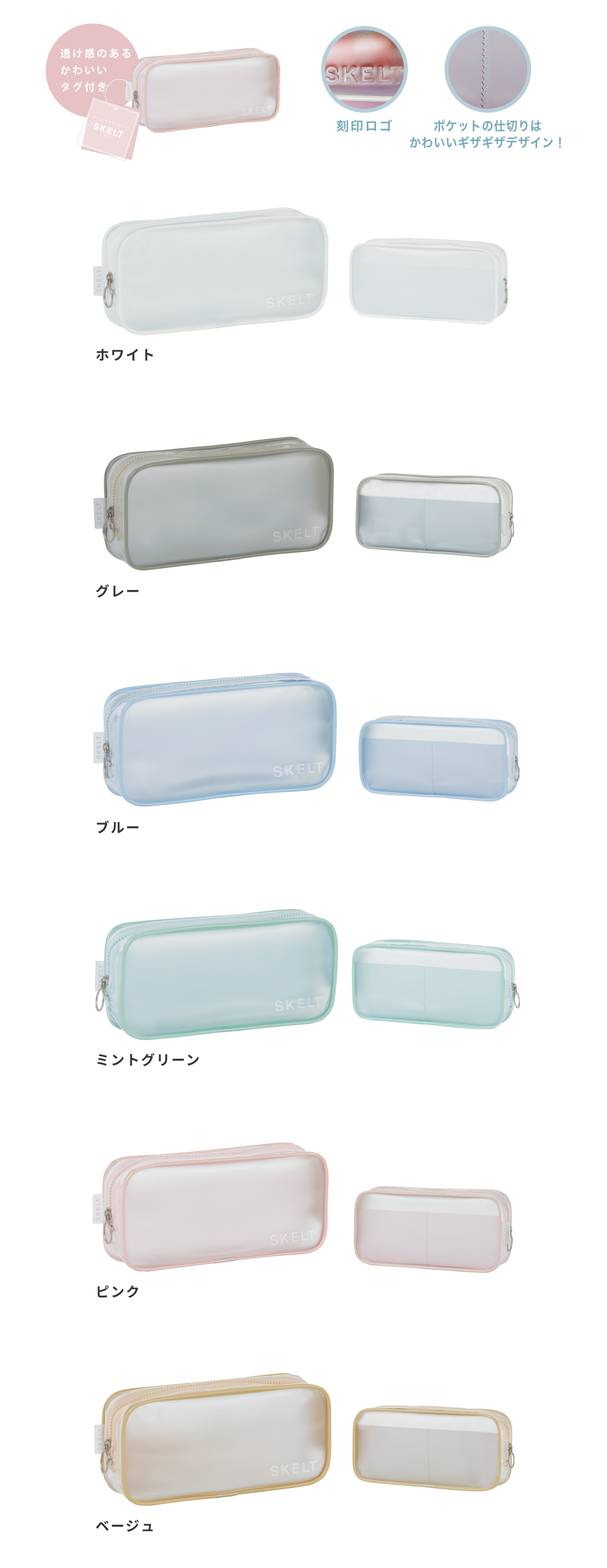 ペンポーチ SKELT (スケルト) ¥825-(消費税込) ポケットの仕切りはかわいいギザギザデザイン! 【本体サイズ】W:190×H90×D40mm 【本体重量】42g 【材質】PVC 【パッケージ】なし(タグ・ループ付)【生産国】中国 【JANコード】ホワイト:4901770697000 グレー:4901770697017 ブルー:4901770697024 ミントグリーン:4901770697031 ピンク:4901770697048 ベージュ:4901770697055
