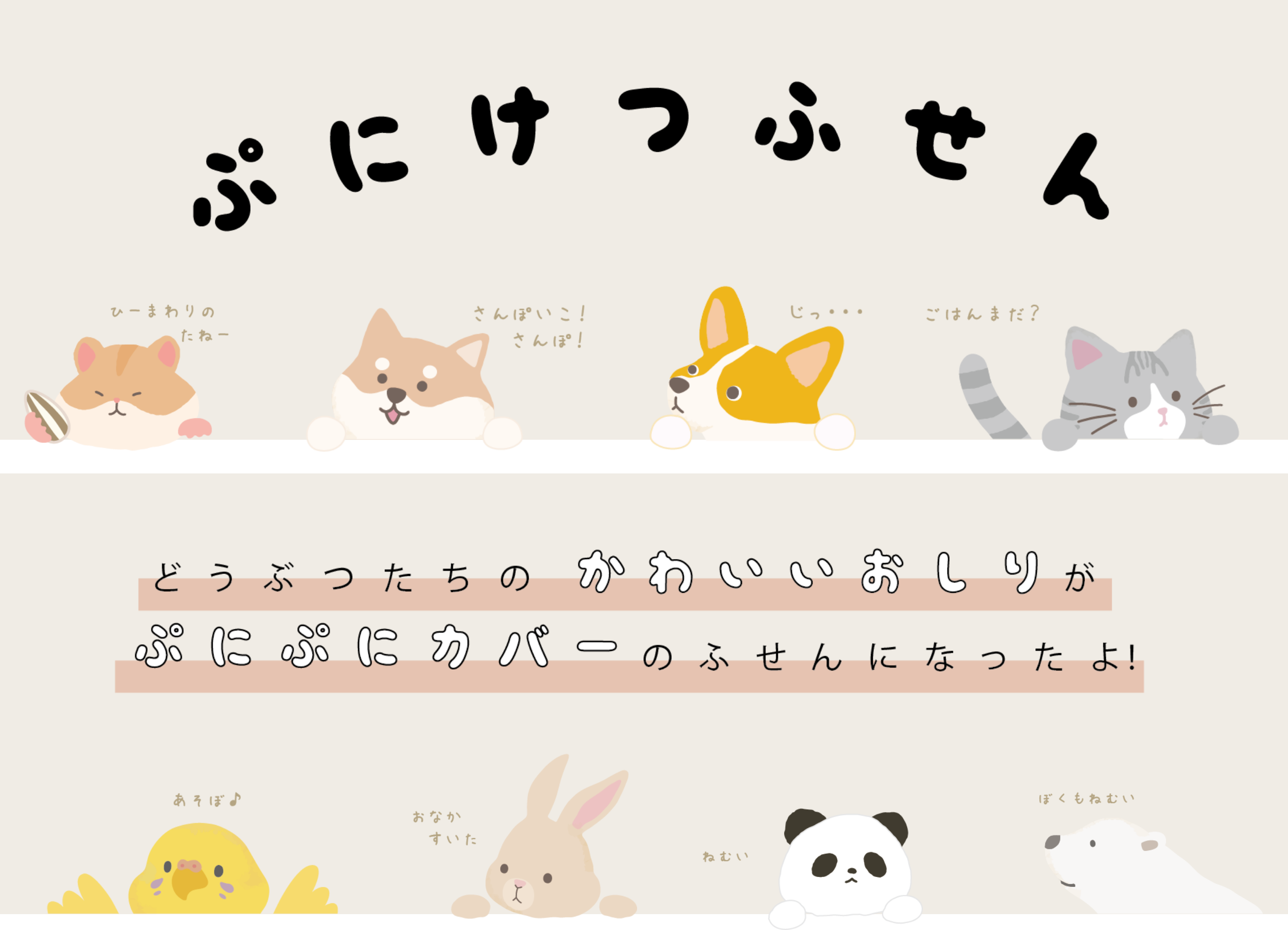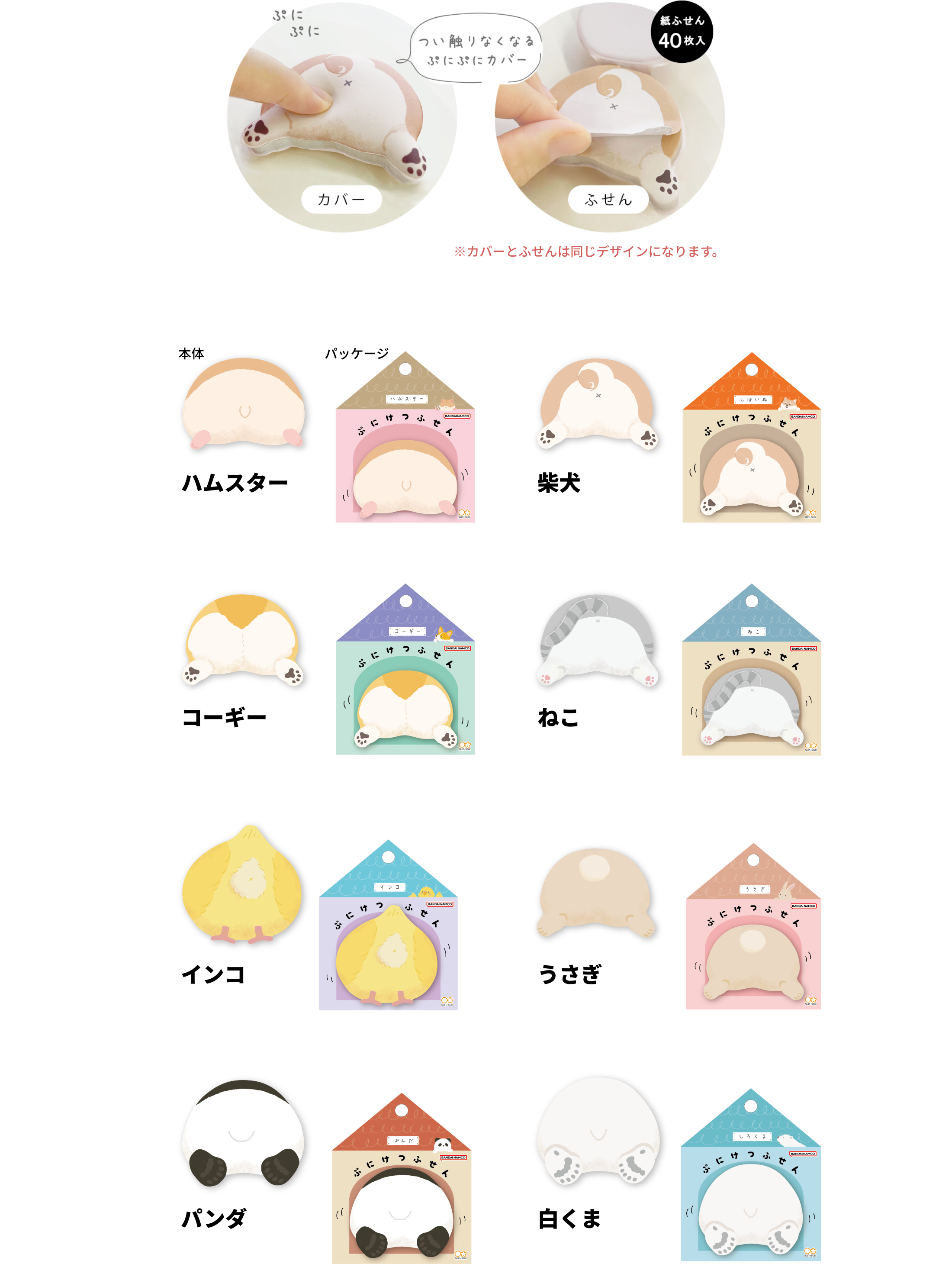 【本体サイズ】約W65×H55×D25mm【本体重量】約23g【材質】付箋:紙 / カバー:PVC【内容】1柄 40枚【パッケージ】台紙付PP袋【パッケージ入サイズ】約W90×H115×D28mm【パッケージ入重量】約28g【生産国】中国【JANコード】ハムスター:4901770707563 柴犬:4901770707570 コーギー:4901770707587 ねこ:4901770707594 インコ:4901770707600 うさぎ:4901770707617 パンダ:4901770707624 白くま:4901770707631