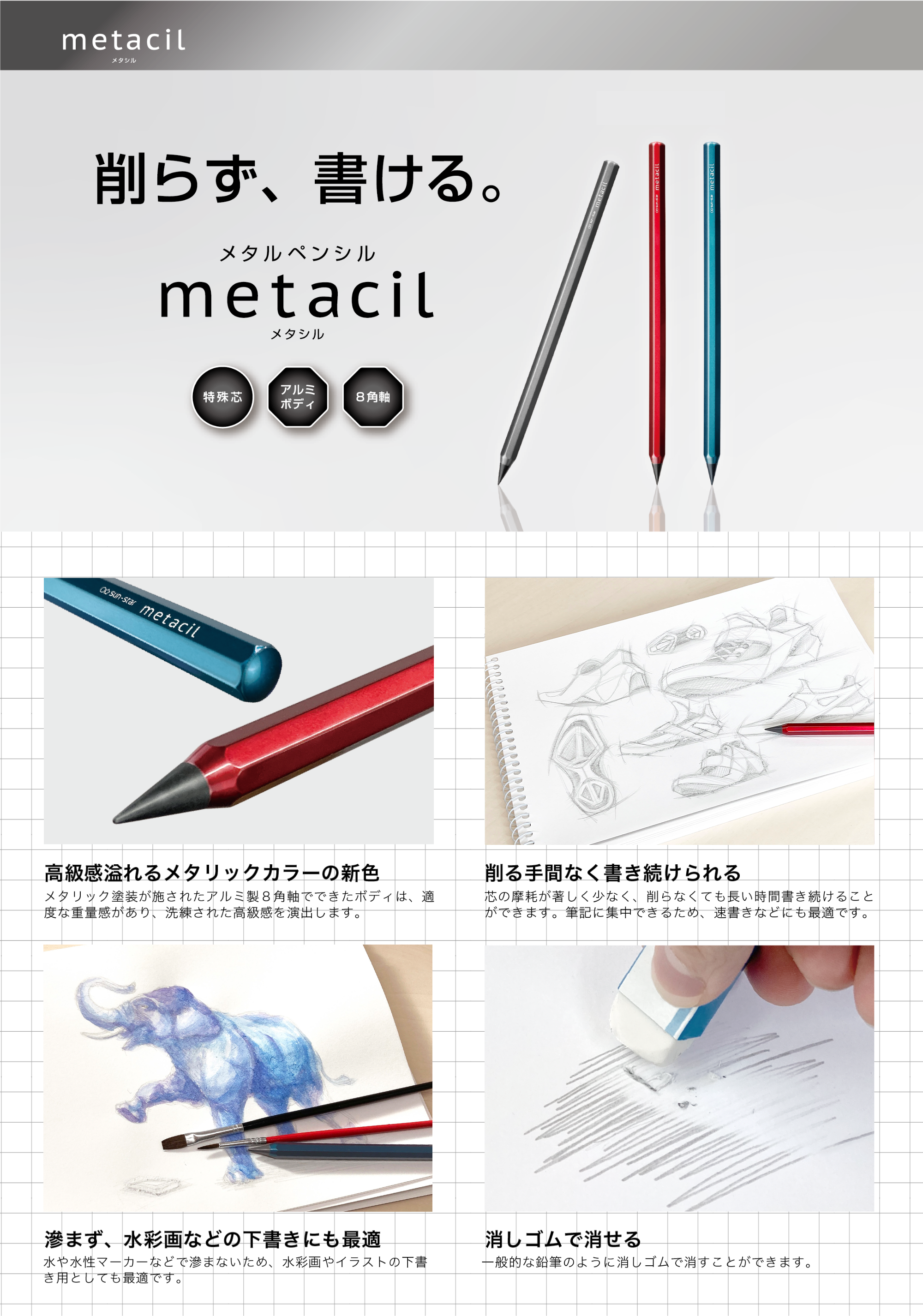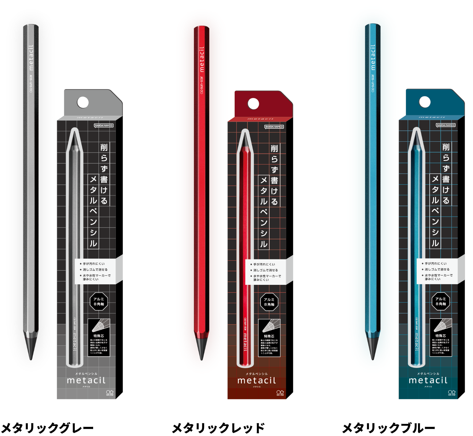 metacil(メタシル) メタリックカラー ¥990-(消費税込) 【本体サイズ】W7.8×H160×D7.8mm 【本体重量】14g 【材質】アルミニウム・特殊黒鉛・銅【パッケージ】ヘッダー付紙箱 【パッケージ入サイズ】W40×H208×D10mm 【パッケージ入重量】24g 【生産国】中国【JANコード】メタリックグレー:4901770709697 メタリックレッド:4901770709703 メタリックブルー:4901770709710