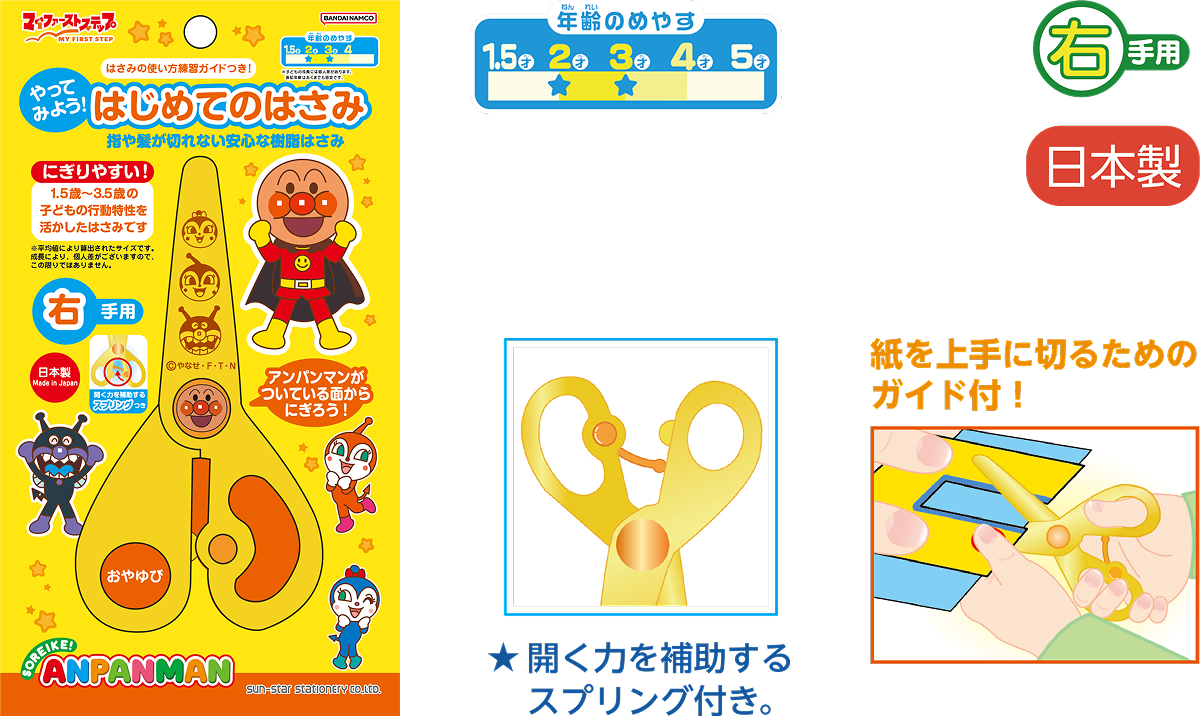やってみよう!はじめてのはさみ ¥715-(消費税込) はじめてはさみを持つお子様のはさみの練習用に。 指や髪が切れない安全な樹脂性はさみ。 【本体サイズ】W63×H115×D11mm 【本体重量】はさみ:21g【材質】本体:PS / マスコット:ABS / スプリング:POM / ガイド:紙【内容】はさみ:1個 / ガイド:1個【パッケージ】台紙付ブリスター(穴あき)【パッケージ入サイズ】W95×H178×D18mm【パッケージ入重量】52g 【生産国】日本【JANコード】4901771318997