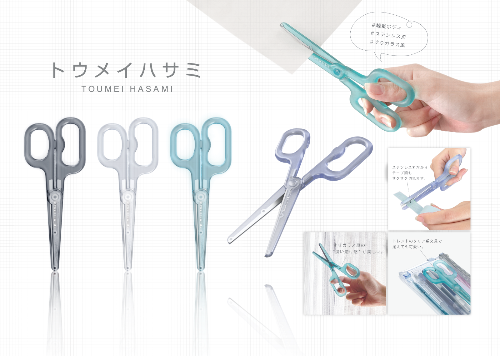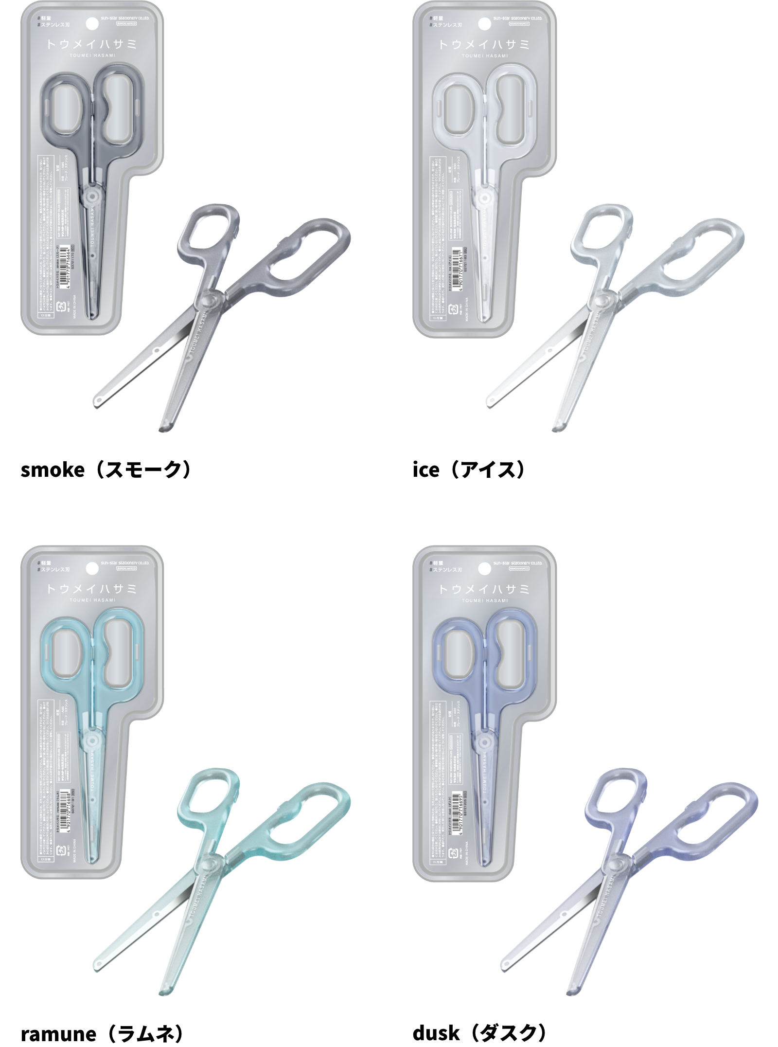 トウメイハサミ ¥935-(消費税込) 【本体サイズ】W64×H160×D6mm 【本体重量】約28g 【材質】ABS・ステンレス【パッケージ】ヘッダー付ブリスター 【パッケージ入サイズ】W90×H210×D10mm 【パッケージ入重量】約46g 【生産国】中国【JANコード】smoke(スモーク):4901770716664 ice(アイス):4901770716671 ramune(ラムネ):4901770716688 dusk(ダスク):4901770716695