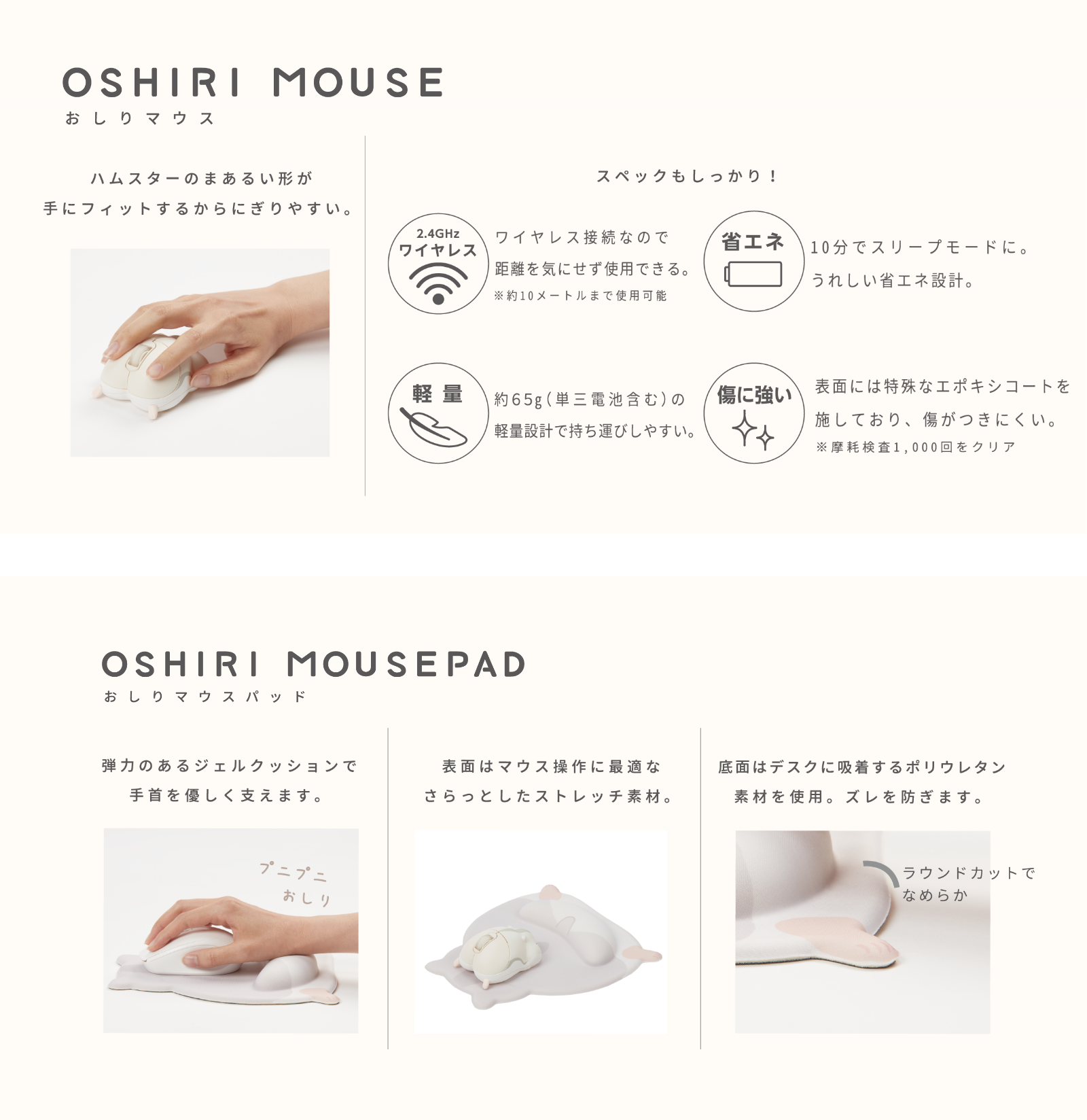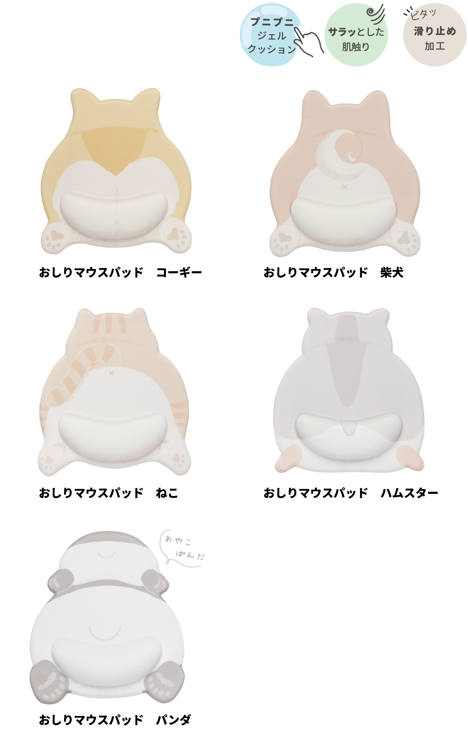 【本体サイズ】約W190×H210×D24mm【本体重量】約205g【材質】PPG・ポリエステル・ポリウレタン【パッケージ】ブリスター【パッケージ入サイズ】約W258×H300×D30mm【パッケージ入重量】約230g【生産国】中国【JANコード】おしりマウスパッド コーギー:4901770721019 おしりマウスパッド 柴犬:4901770721026 おしりマウスパッド ねこ:4901770721033 おしりマウスパッド ハムスター:4901770721040 おしりマウスパッド パンダ:4901770721057