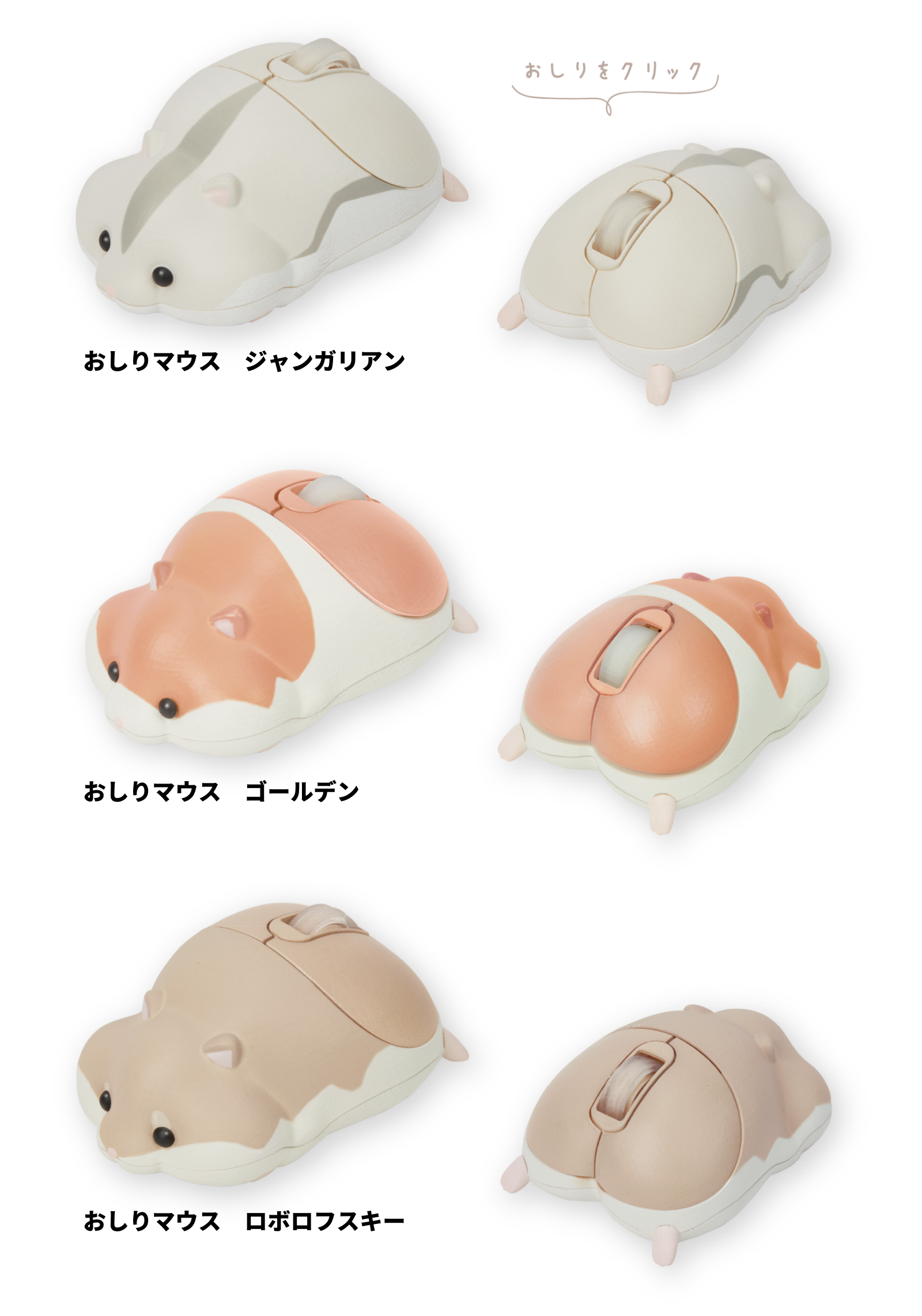 【本体サイズ】約W62×H41×D85mm【本体重量】約41g【材質】ABS【パッケージ】ブリスター【パッケージ入サイズ】約W150×H170×D50mm【パッケージ入重量】約55g【生産国】中国【JANコード】おしりマウス ジャンガリアン:4901770720982 おしりマウス ゴールデン:4901770720999 おしりマウス ロボロフスキー:4901770721002