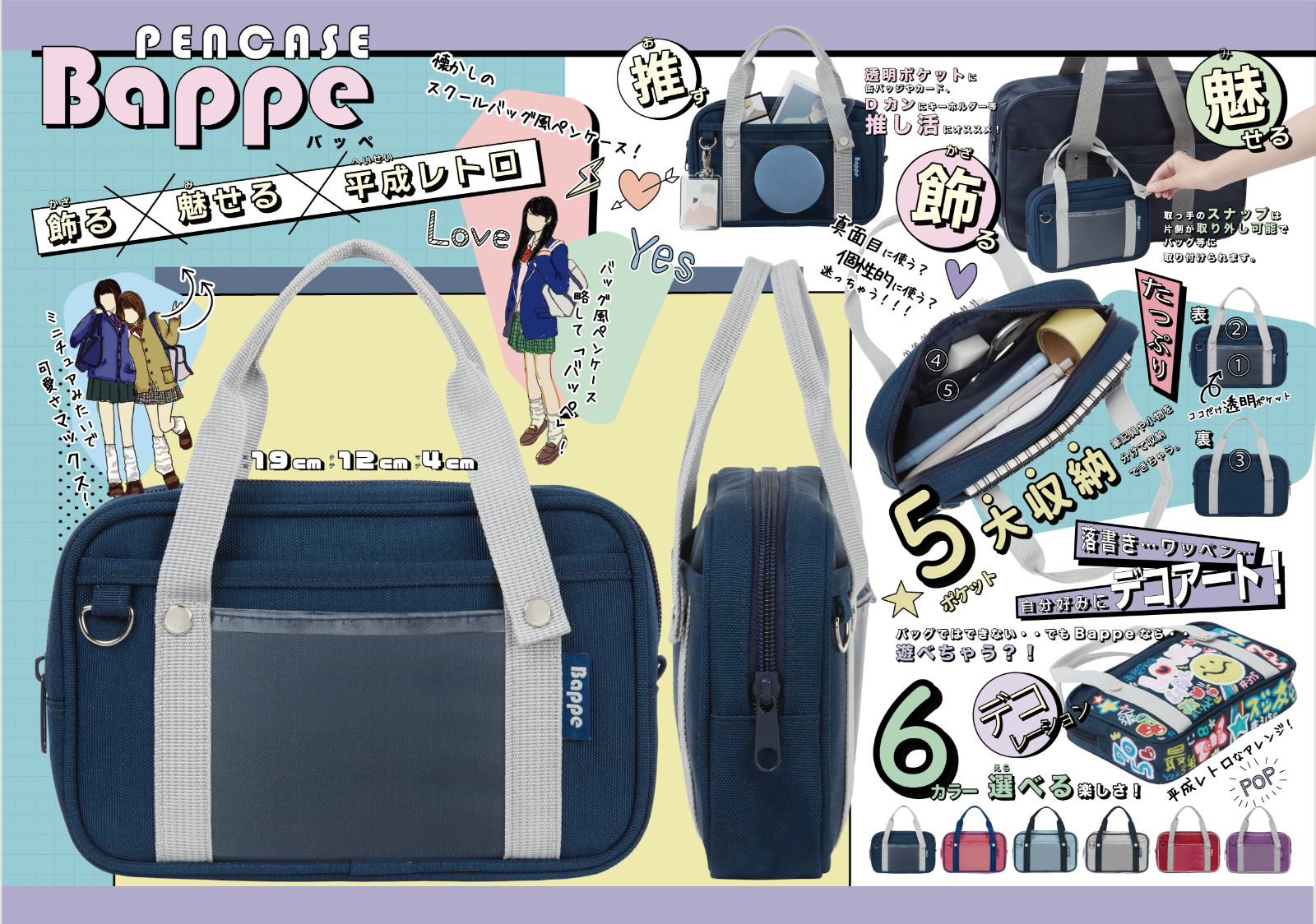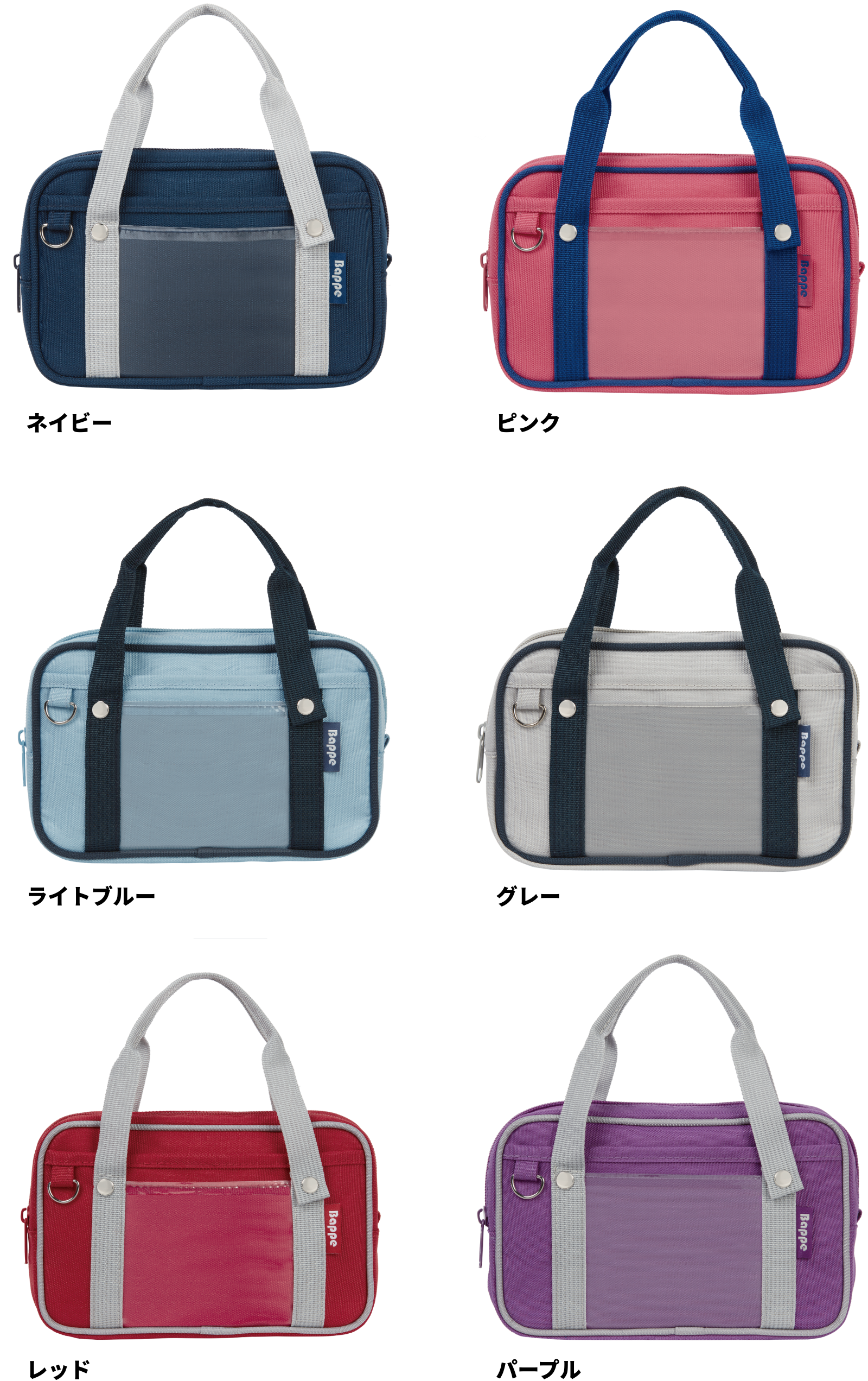 ペンケース Bappe(バッペ) ¥1,485-(消費税込) 【本体サイズ】W190×H120×D40mm【本体重量】約90g【材質】ポリエステル・PVC【パッケージ】なし(タグ・ループ付)【生産国】中国【JANコード】ネイビー:4901770743646 ピンク:4901770743653 ライトブルー:4901770743660 グレー:4901770743677 レッド:4901770743684 パープル:4901770743691