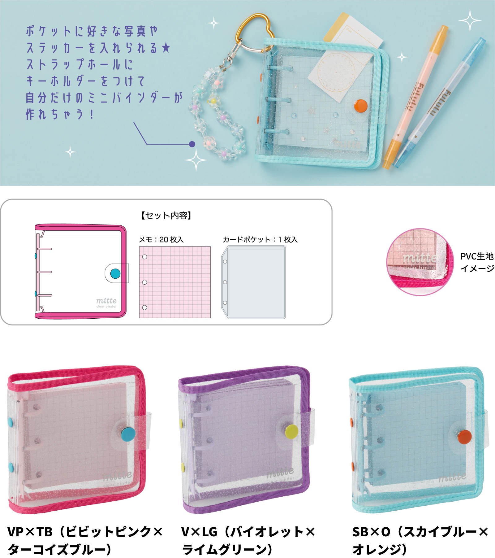 【本体サイズ】W110×H110×D25mm【本体重量】70g【材質】PVC・ポリエステル・鉄・紙【内容】本文:20枚/カードポケット:1枚【パッケージ】なし【生産国】中国【JANコード】VP×TB(ビビットピンク×ターコイズブルー):4901770743011 V×LG(バイオレット×ライムグリーン):4901770743028 SB×O(スカイブルー×オレンジ):4901770743035