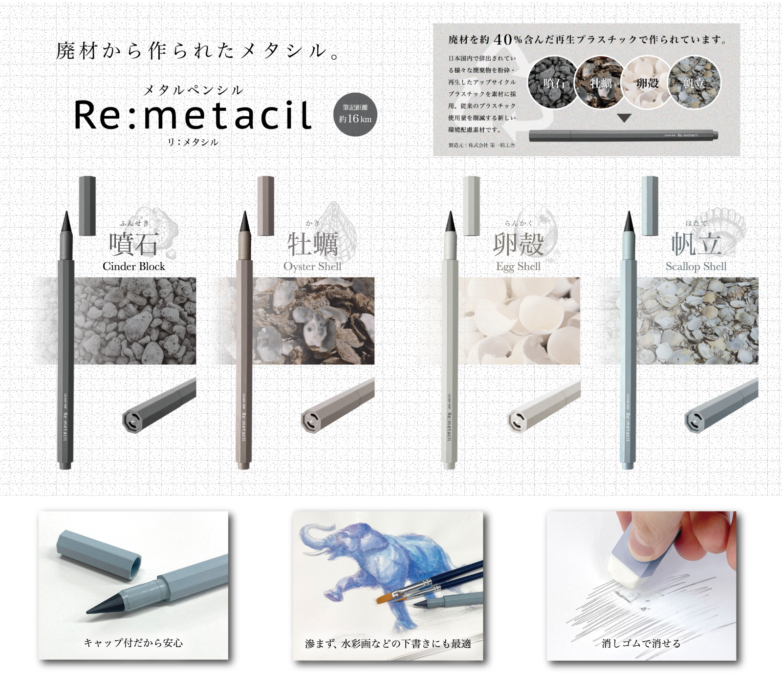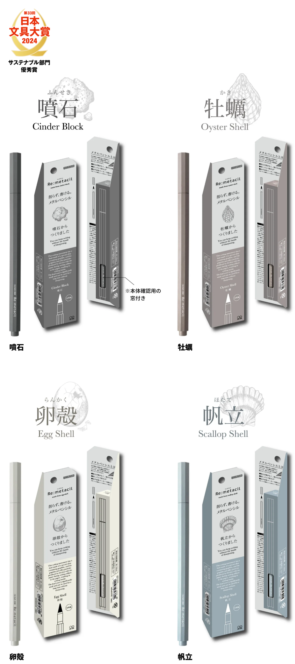 【本体サイズ】W9×H143×D9mm【本体重量】15g【材質】噴石:PA+噴石・特殊黒鉛・銅/牡蠣:PA+牡蠣殻・特殊黒鉛・銅/卵殻:PA+卵殻・特殊黒鉛・銅/帆立:PA+帆立殻・特殊黒鉛・銅【パッケージ】ヘッダー付紙箱【パッケージ入サイズ】W40×H208×D18mm 【パッケージ入重量】25g【生産国】芯:中国/軸:日本【JANコード】 噴石:4901770743875 牡蠣:4901770743882 卵殻:4901770743899 帆立:4901770743905