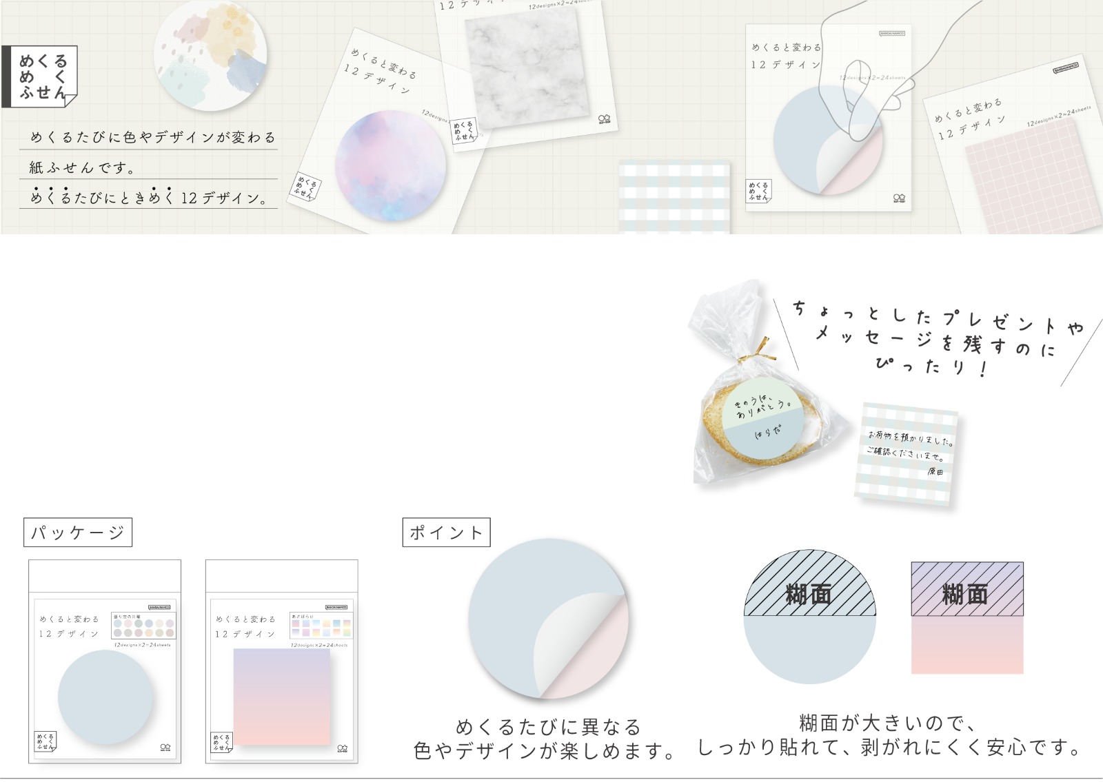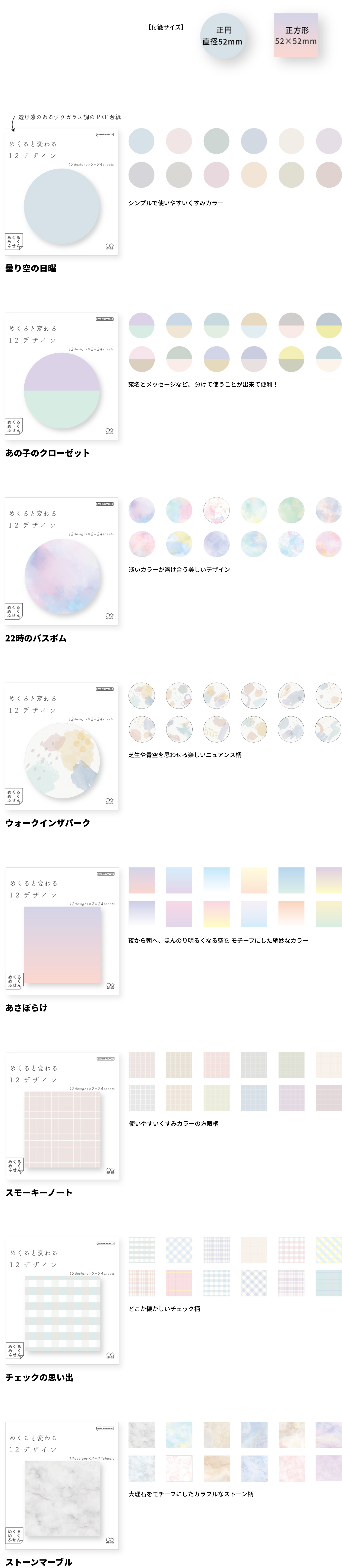 【本体サイズ】約W80×H90×D4mm【本体重量】約8g【材質】付箋:紙/台紙:PET【内容】12柄 各2枚 計24枚【パッケージ】ヘッダー付きPP袋【パッケージ入サイズ】約W83×H120×D5mm【パッケージ入重量】約10g【生産国】日本【JANコード】曇り空の日曜:4901770760940 あの子のクローゼット:4901770760957 22時のバスボム:4901770760964 ウォークインザパーク:4901770760971 あさぼらけ:4901770760988 スモーキーノート:4901770760995 チェックの思い出:4901770761008 ストーンマーブル:4901770761015