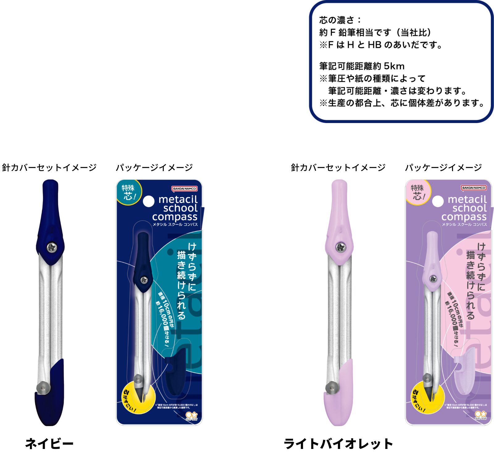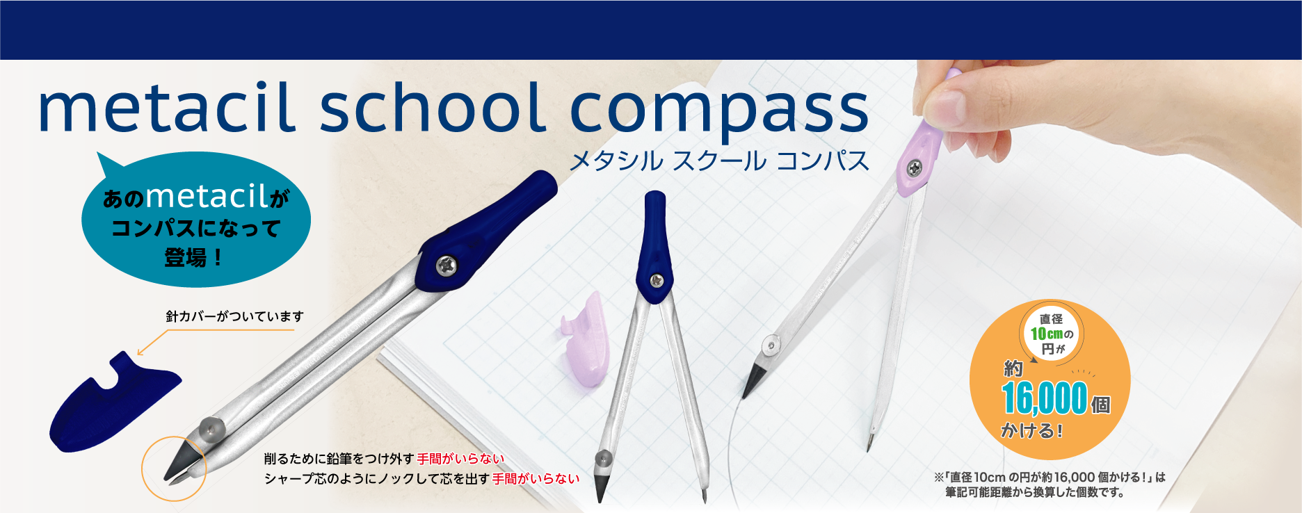 metacil school compass(メタシル スクール コンパス) ¥825-(消費税込) 【本体サイズ】W13.5×H120×D12mm(針カバーなし)【本体重量】15g【材質】本体:亜鉛合金・ABS・特殊黒鉛/針カバー:ABS【パッケージ】ヘッダー付ブリスター【パッケージ入サイズ】W60×H170×D15mm【生産国】中国【JANコード】ネイビー:4901770743820 ライトバイオレット:4901770743837