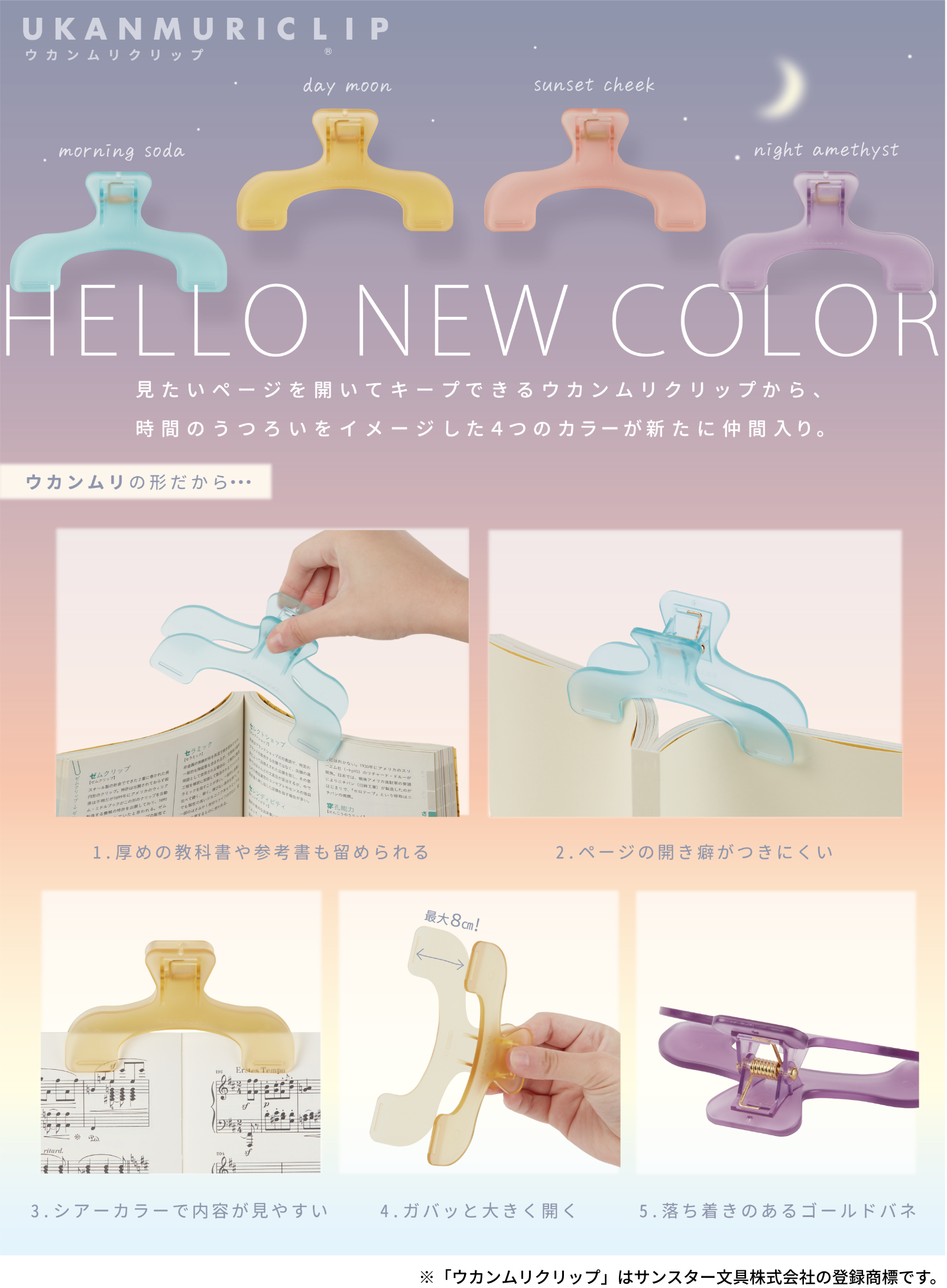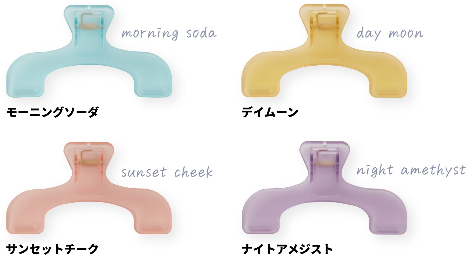 ウカンムリクリップ ¥660-(消費税込) 【本体サイズ】約W120×H76×D40mm【本体重量】約33g【材質】ABS【パッケージ】ヘッダー付きスタンドブリスター【パッケージ入サイズ】約W150×H90×D45mm【パッケージ入重量】約49g【生産国】中国【JANコード】モーニングソーダ:4901770796826 デイムーン:4901770796833 サンセットチーク:4901770796840 ナイトアメジスト:4901770796857