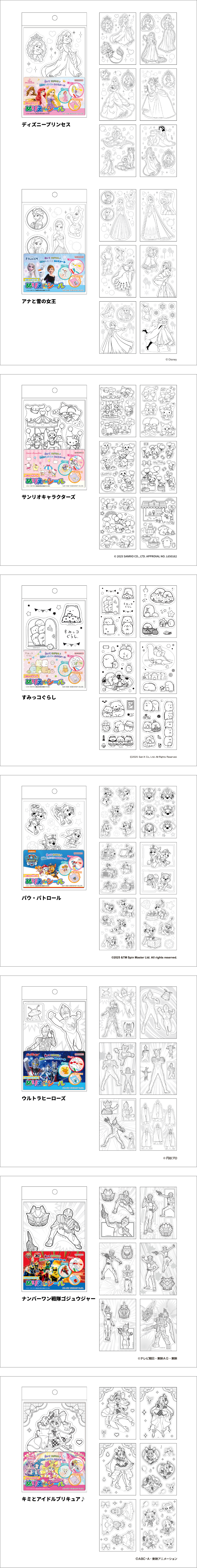 【本体サイズ】約W128×H182mm【本体重量】約32g【材質】上質紙【内容】ぬりえシート:6柄 各1枚 計6枚【パッケージ】台紙付PP袋【パッケージ入サイズ】約W128×H212×D2mm【パッケージ入重量】約35g【生産国】中国【JANコード】ディズニープリンセス:4901771319833 アナと雪の女王:4901771319840 サンリオキャラクターズ:4901771319857 すみっコぐらし:4901771319864 パウ・パトロール:4901771319871 ウルトラヒーローズ:4901771319888 ナンバーワン戦隊ゴジュウジャー:4901771319901 キミとアイドルプリキュア♪:4901771319895