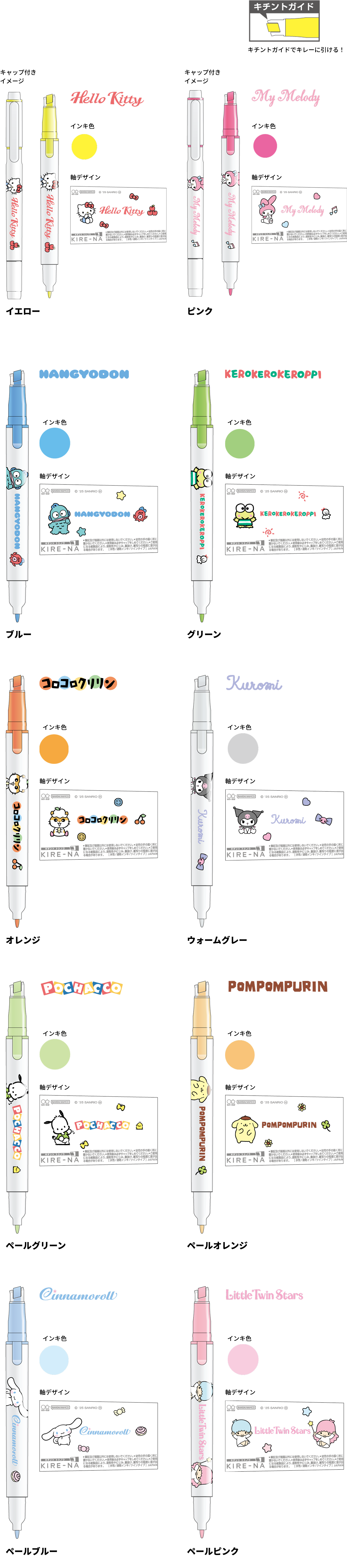 【本体サイズ】約Φ11×H137mm 【本体重量】8.7g 【材質】PP 【インク】水性顔料インキ【パッケージ】なし 【生産国】日本【JANコード】 ハローキティ イエロー:4901770811161 マイメロディ ピンク:4901770811178 ハンギョドン ブルー:4901770811185 けろけろけろっぴ グリーン:4901770811192 コロコロクリリン オレンジ:4901770811208 クロミ ウォームグレー:4901770811215 ポチャッコ ペールグリーン:4901770811222 ポムポムプリン ペールオレンジ:4901770811239 シナモロール ペールブルー:4901770811246 リトルツインスターズ ペールピンク:4901770811253