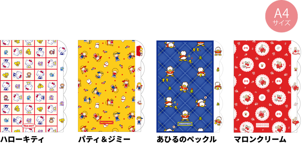 【本体サイズ】W225×H310×D2mm 【本体重量】72g 【材質】PP 【パッケージ】なし 【生産国】日本【JANコード】ハローキティ:4901770821887 パティ&ジミー:4901770821894 あひるのペックル:4901770823287 マロンクリーム:4901770823294