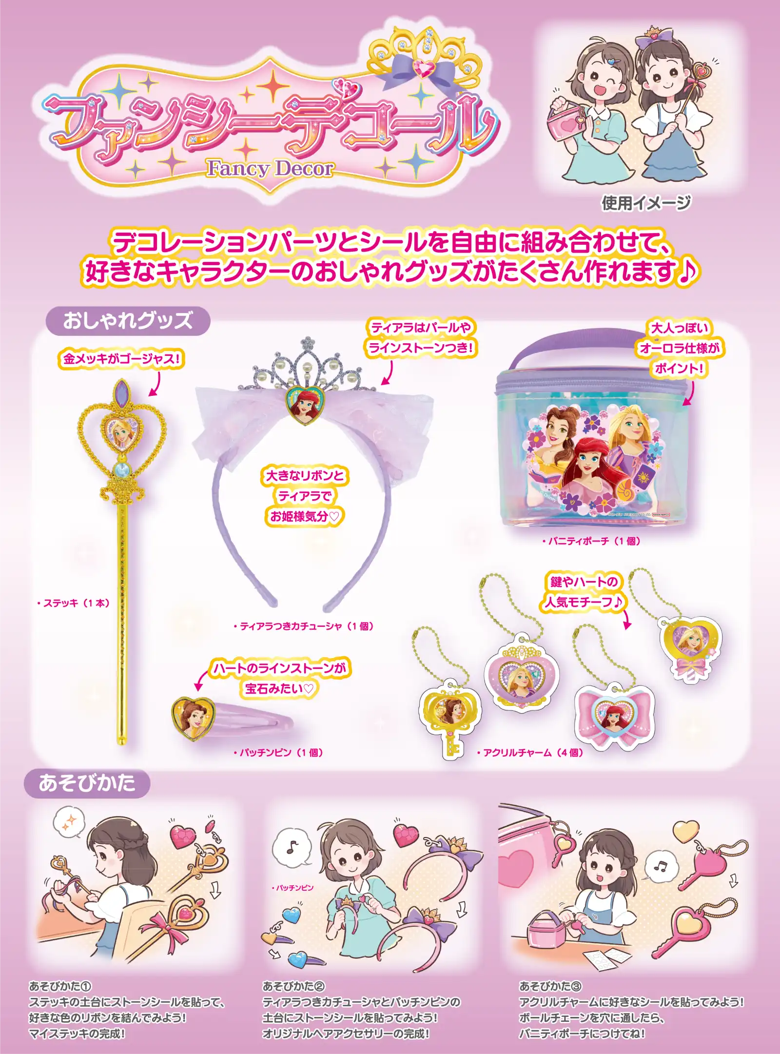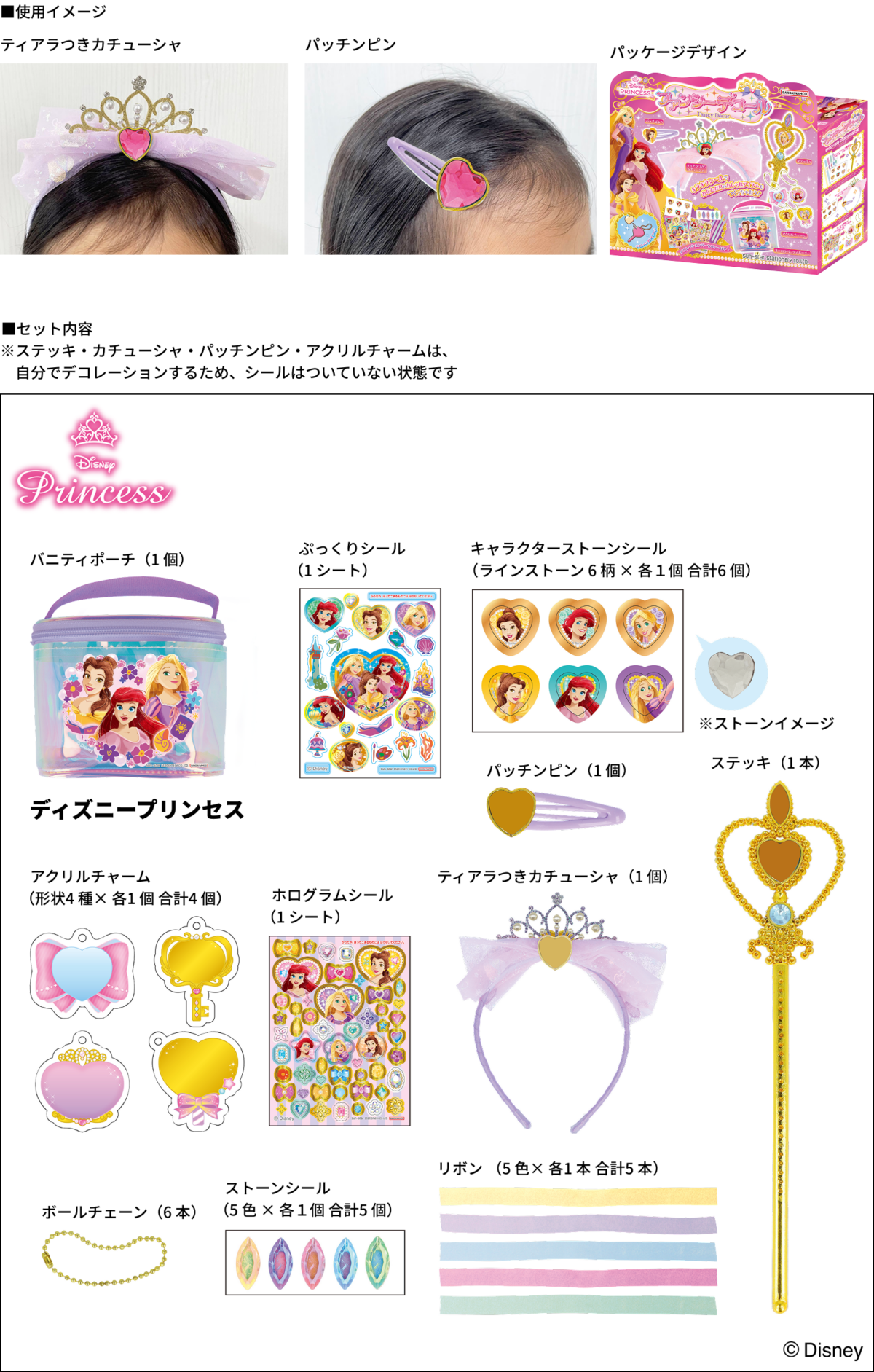 【本体サイズ】ステッキ:約W70×H310×D5mm /ティアラつきカチューシャ:約W120×H185×D10mm /バニティポーチ:約W130×H120×D80mm /パッチンピン:約W60×H25×D5mm /アクリルチャーム:約W50×H50×D3mm /ボールチェーン:長さ 約130mm /リボン:約W500×H20×D0.5mm /ホログラムシール:約W85×H115×D0.5mm /ぷっくりシール:約W85×H115×D0.5mm /キャラクターストーンシール:1個あたり約W25×H25×D5mm /ストーンシール:1個あたり 約W10×H25×D5mm 【本体重量】約180 g 【材質】ステッキ:PP /ティアラつきカチューシャ:ABS・PVC・亜鉛合金・ポリエステル・ガラス /バニティポーチ:TPU・ポリエステル /パッチンピン:鉄・亜鉛合金 /アクリルチャーム:PMMA /ボールチェーン:銅 /リボン:ポリエステル /ホログラムシール:PET /ぷっくりシール:PVC /キャラクターストーンシール:PMMA・PET /ストーンシール:PMMA 【内容】ステッキ:1個/ティアラつきカチューシャ:1個 /バニティポーチ:1個 /パッチンピン:1個 /アクリルチャーム:形状4種×各1個 合計4個 /ボールチェーン:6本 /リボン:5色×各1本 合計5本 /ホログラムシール:1シート /ぷっくりシール:1シート /キャラクターストーンシール:6柄×各1個 合計6個/ストーンシール:5色×各1個 合計5個【パッケージ】紙箱【パッケージ入サイズ】約W360×H265×D110mm【パッケージ入重量】約300 g 【生産国】中国【JANコード】ディズニープリンセス:4901771320402 キミとアイドルプリキュア♪:4901771320419