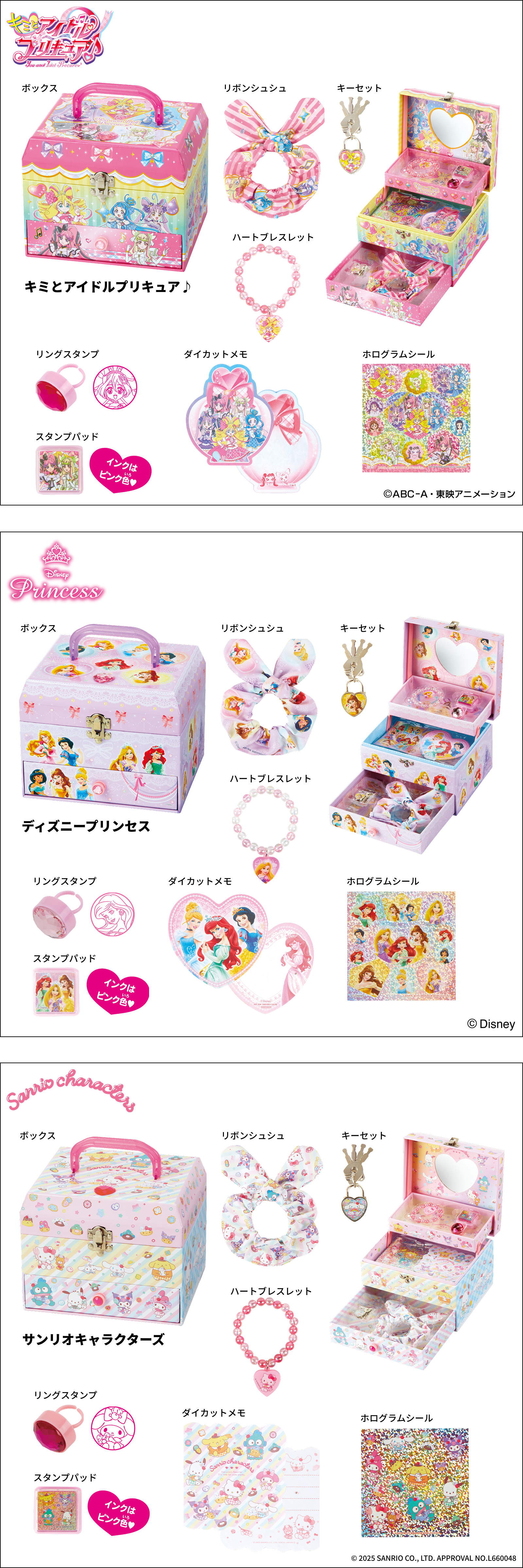 【本体サイズ】ボックス:W190×H155×D160mm【本体重量】約660g【材質】ボックス:紙・鉄・ABS・PMMA キーセット:鉄・亜鉛合金・PET/ ダイカットメモ:紙/ ホログラムシール:PET・紙/ スタンプパッド:ABS・EVA・PET/ リングスタンプ:PP・合成ゴム・PMMA / リボンシュシュ:ポリエステル/ ハートブレスレット :ABS・ポリエステル・鉄【内容】ボックス本体:1 個/ キーセット:1 個/ ダイカットメモ:10 枚/ ホログラムシール:1 枚 スタンプパッド:1 個/ リングスタンプ:1 個/ リボンシュシュ:1 個/ ハートブレスレット :1 個【パッケージ】紙箱【パッケージ入サイズ】約W200×H180×D180mm【パッケージ入重量】約785g【生産国】中国【JANコード】キミとアイドルプリキュア♪:4901771320341 ディズニープリンセス:4901771320358 サンリオキャラクターズ:4901771320365