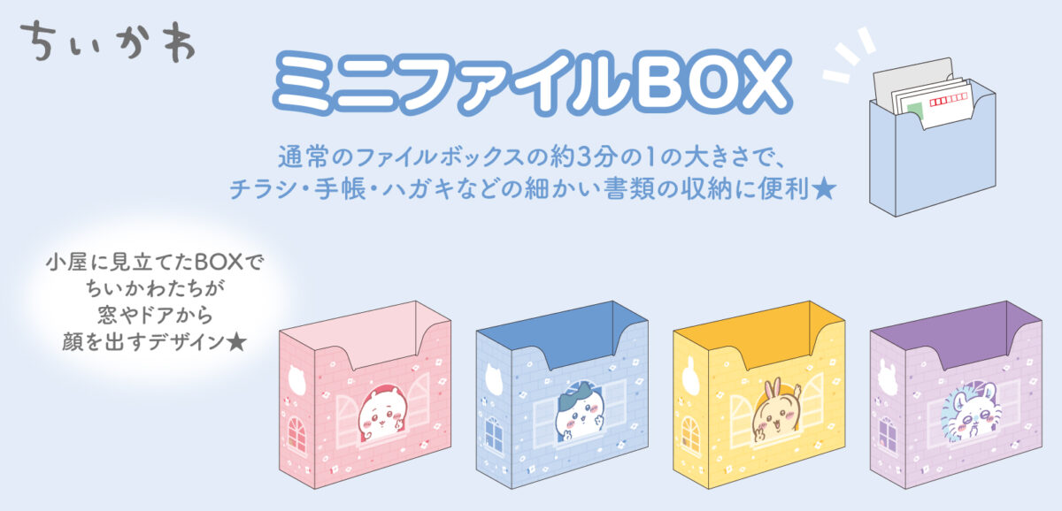 ミニファイルBOX ¥605-(消費税込) 【本体サイズ】W169×H142×D67mm(組み立て時) 【本体重量】50g 【材質】紙【パッケージ】PP袋 【パッケージ入サイズ】W242×H148×D2mm 【パッケージ入重量】54g 【生産国】日本【JANコード】ちいかわ:4901770811758 ハチワレ:4901770811765 うさぎ:4901770811772 モモンガ:4901770811949