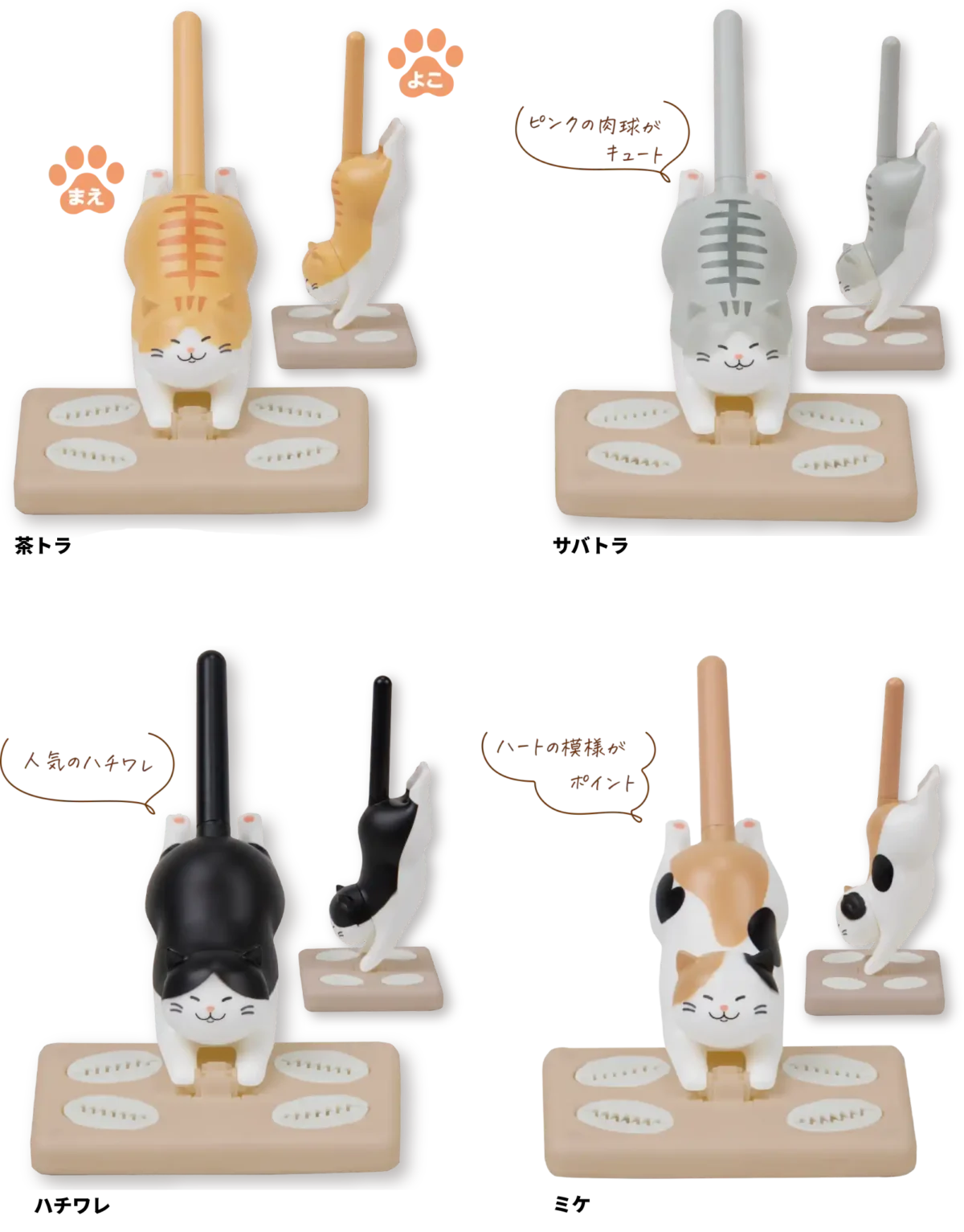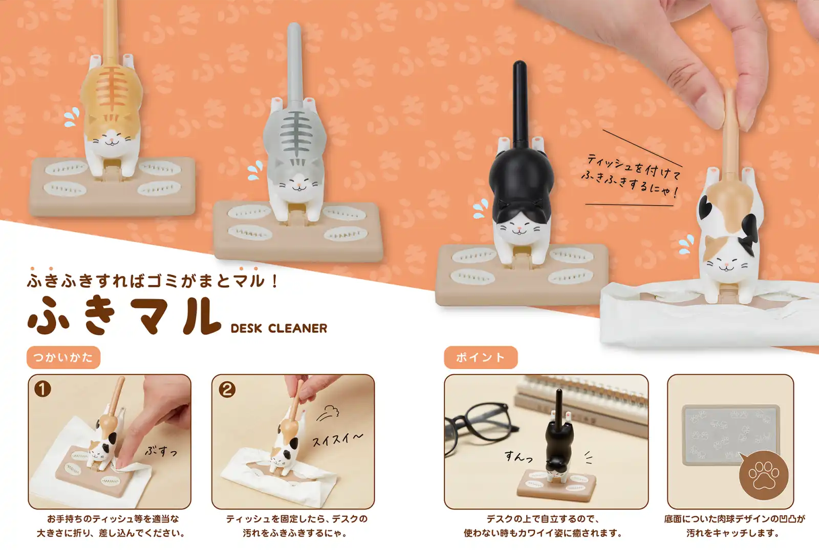 卓上クリーナー ふきマル ¥990-(消費税込) 【本体サイズ】約W72×H110×D45mm【本体重量】約24g【材質】ABS・PP・シリコーン【パッケージ】ヘッダー付ブリスター【パッケージ入サイズ】約W110×H180×D30mm 【パッケージ入重量】約44g 【生産国】中国【JANコード】茶トラ:4901770210223 サバトラ:4901770210667 ハチワレ:4901770210711 ミケ:4901770210773