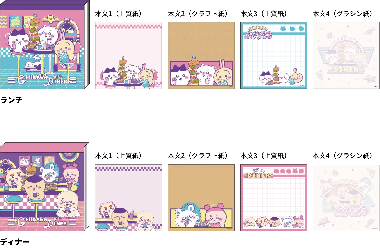 【本体サイズ】W90×H90×D8mm 【本体重量】50g 【材質】紙・PET 【内容】上質紙本文:2柄各20枚/クラフト紙本文:1柄20枚/グラシン紙本文:1柄10枚 計70枚【パッケージ】なし【生産国】日本【JANコード】ランチ:4901770006116 ディナー:4901770006123