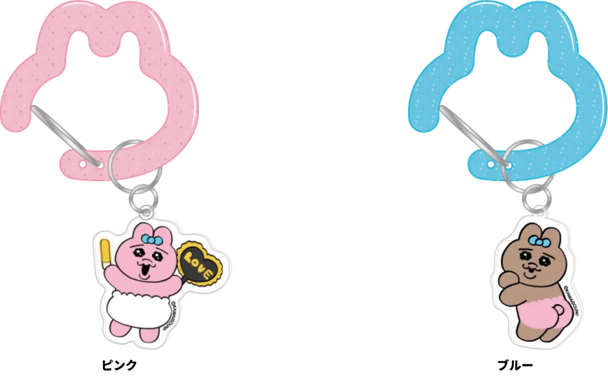 【本体サイズ】カラビナ:W55×H50×D6mm / チャーム:W40×H40×D3mm以内【本体重量】約100g 【 材質】アクリル・金属【パッケージ】台紙付PP袋 【パッケージ入サイズ】W65×H120×D5mm 【生産国】中国【JANコード】ピンク:4901770975948 ブルー:4901770975955
