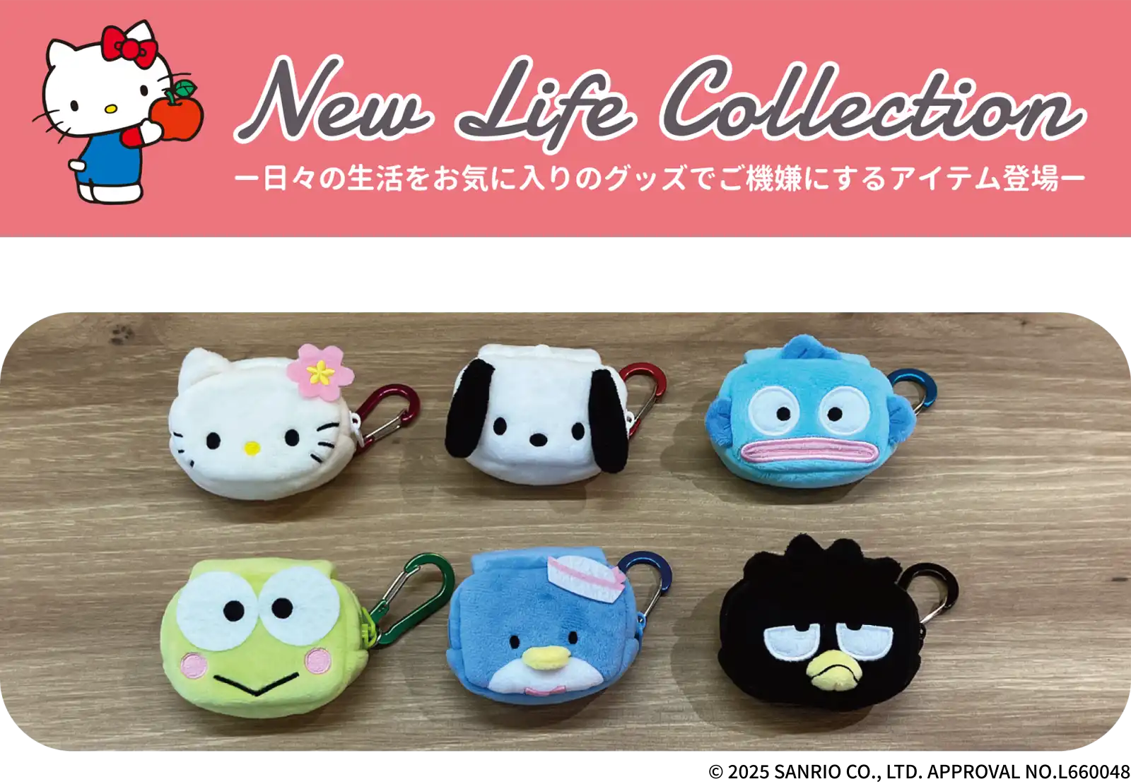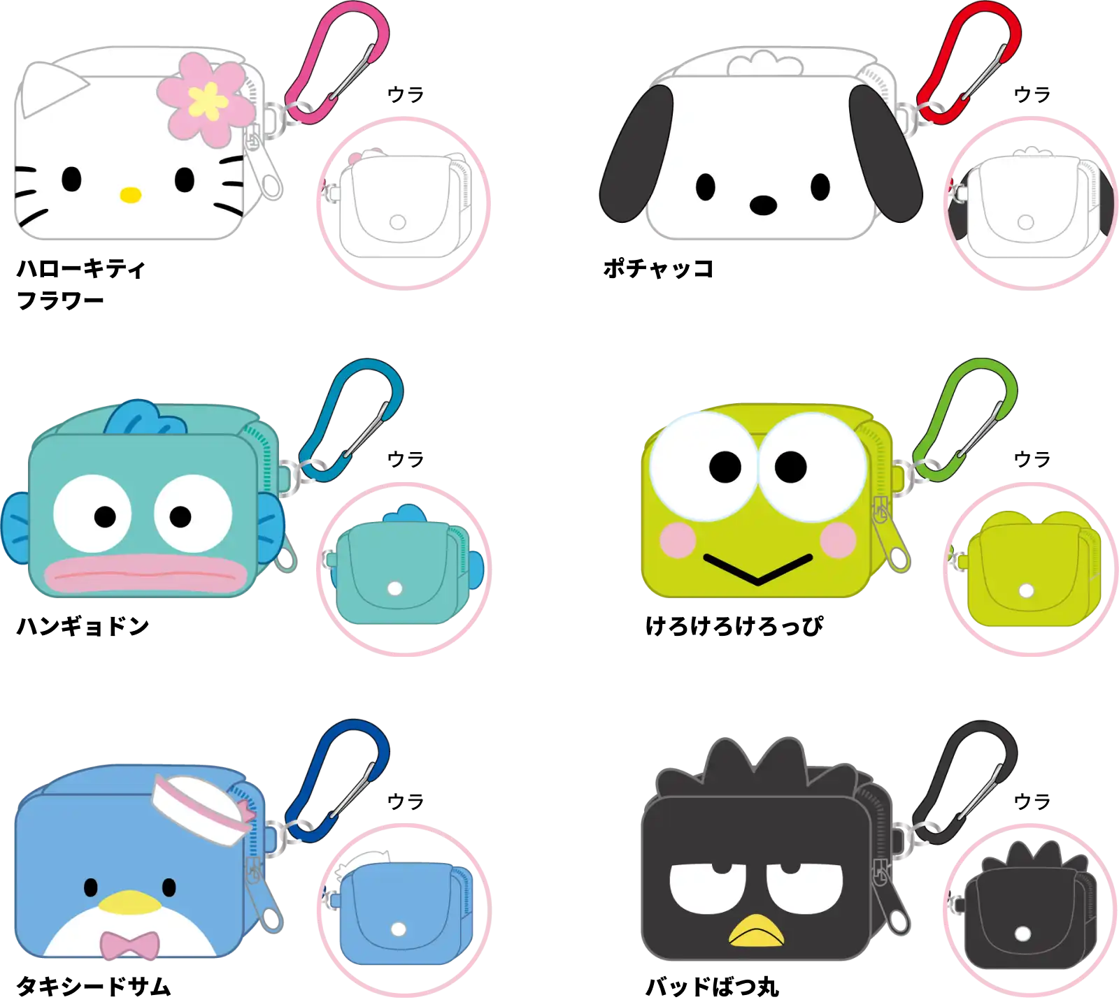 【本体サイズ】約W70×H55×D30mm 【本体重量】約21g 【材質】ポリエステル・アルミ 【パッケージ】なし(タグ・ループ付) 【生産国】中国【JANコード】ハローキティ フラワー:4901770954684 ポチャッコ:4901770954691 ハンギョドン:4901770954707 けろけろけろっぴ:4901770954714 タキシードサム:4901770954721 バッドばつ丸:4901770954905