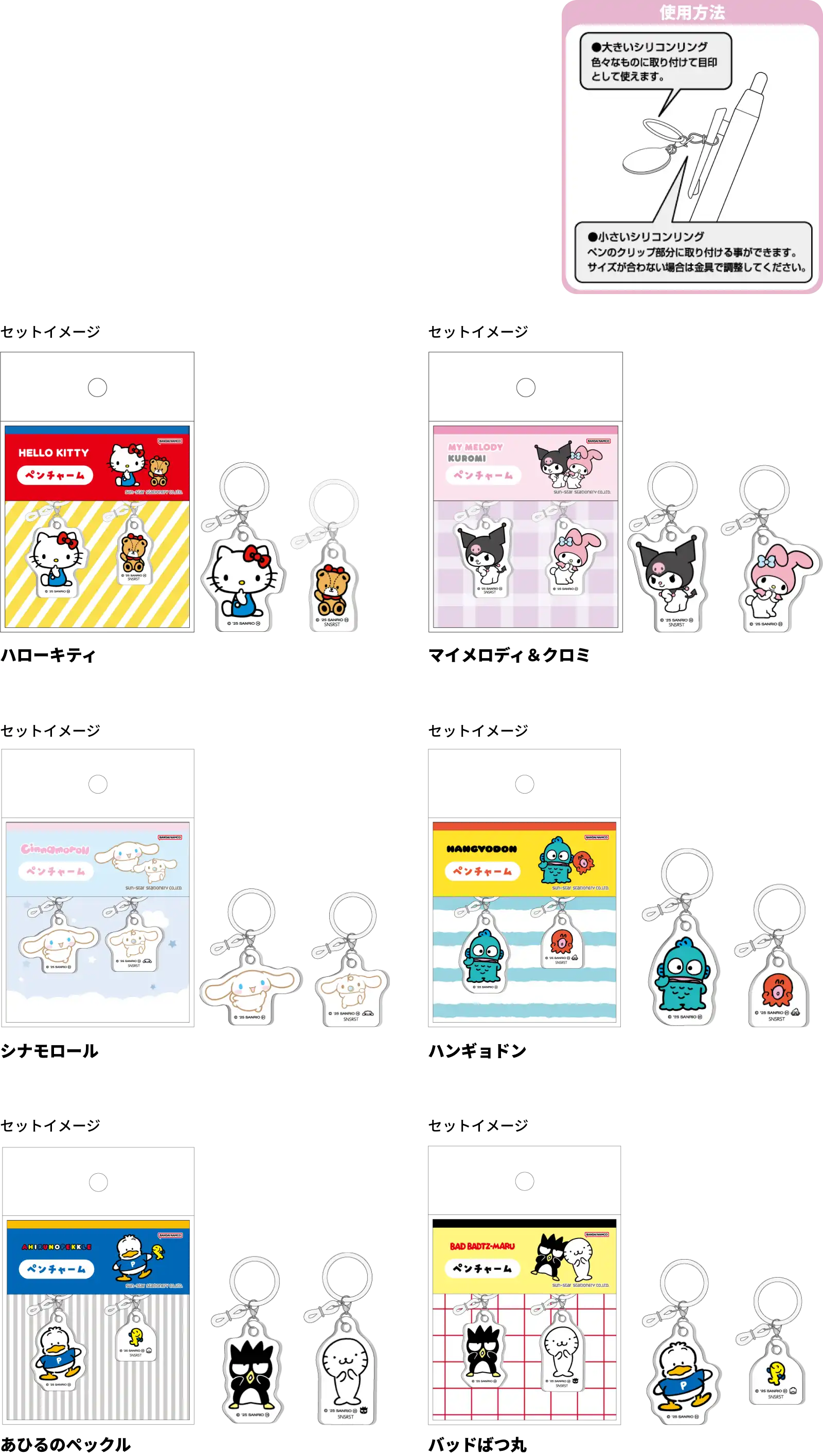 【本体サイズ(ダイカット部分)】W30×H35×D3mm以内【本体重量】約3g(1個) 【材質】アクリル・シリコーン・鉄・真銀【パッケージ】台紙付ヘッダー袋【パッケージ入サイズ】約W85×H120×D3.5mm 【生産国】中国【JANコード】ハローキティ:4901770955179 マイメロディ&クロミ:4901770955186 シナモロール:4901770955193 ハンギョドン:4901770955209 あひるのペックル:4901770955216 バッドばつ丸:4901770955223