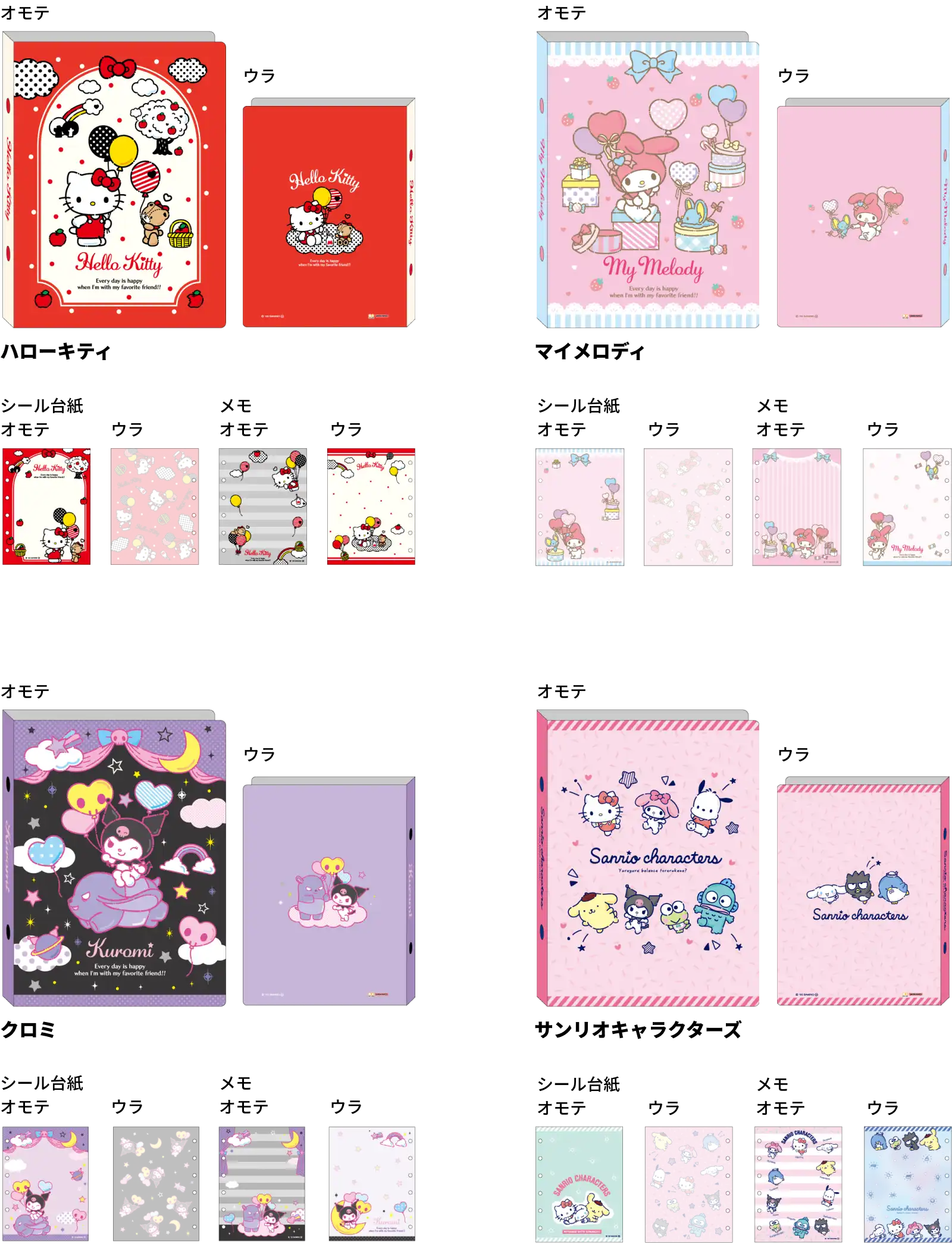 【本体サイズ】W115×H155×D30mm 【本体重量】約150g 【材質】PVC・紙【内容】シール台紙:10枚 / メモ:20枚【パッケージ】ヘッダー付PP袋 【パッケージ入サイズ】W120×H180×D33mm 【生産国】中国【JANコード】ハローキティ:4901770955230 マイメロディ:4901770955247 クロミ:4901770955254 サンリオキャラクターズ:4901770955261