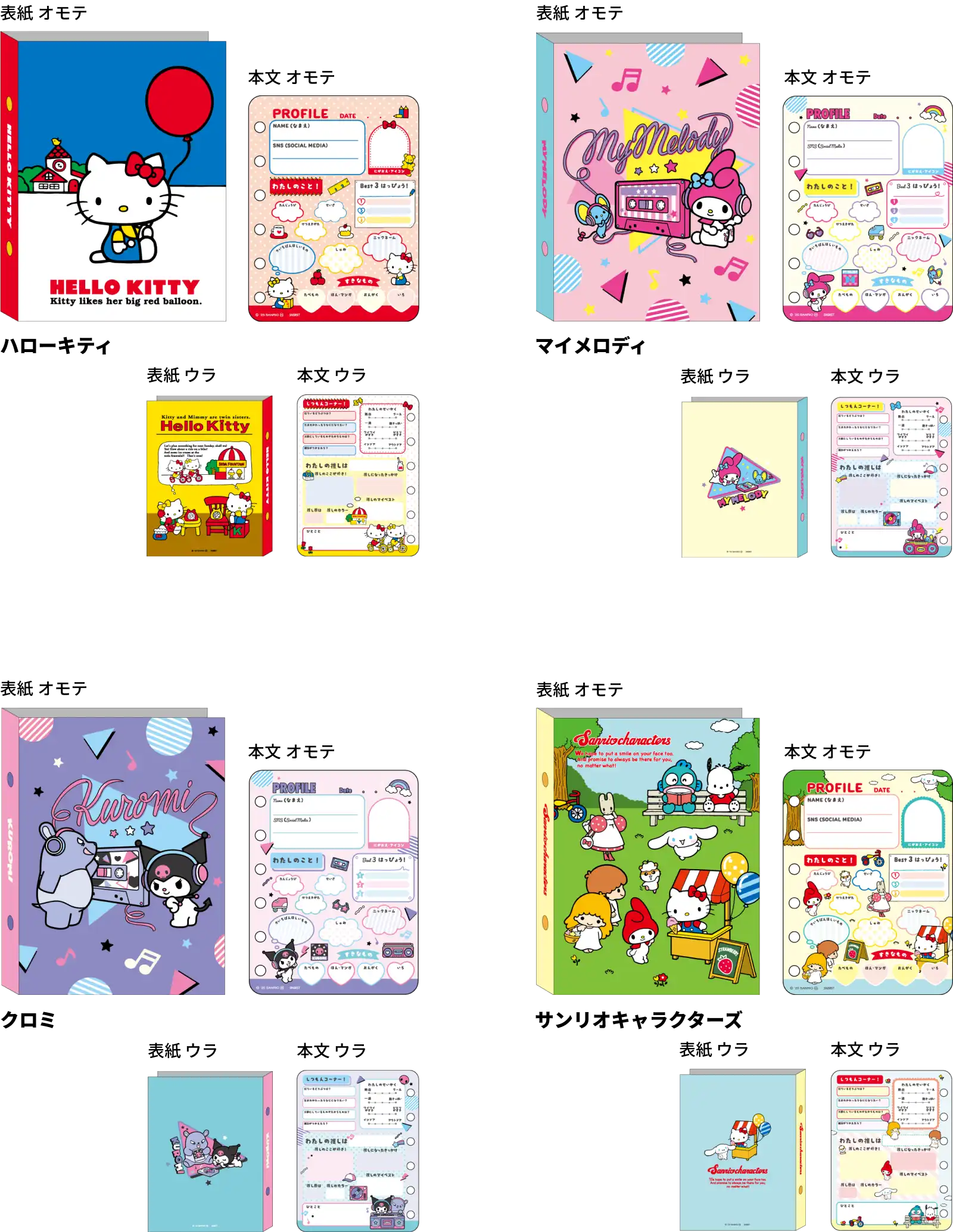 【本体サイズ】約W115×H155×D30mm 【本体重量】120g 【材質】紙・ABS・スチール 【内容】本文:50枚【パッケージ】ヘッダー付PP袋 【パッケージ入サイズ】W120×H180×D33mm 【パッケージ入重量】125g【生産国】中国【JANコード】ハローキティ:4901770956510 マイメロディ:4901770956602 クロミ:4901770957180 サンリオキャラクターズ:4901770957258
