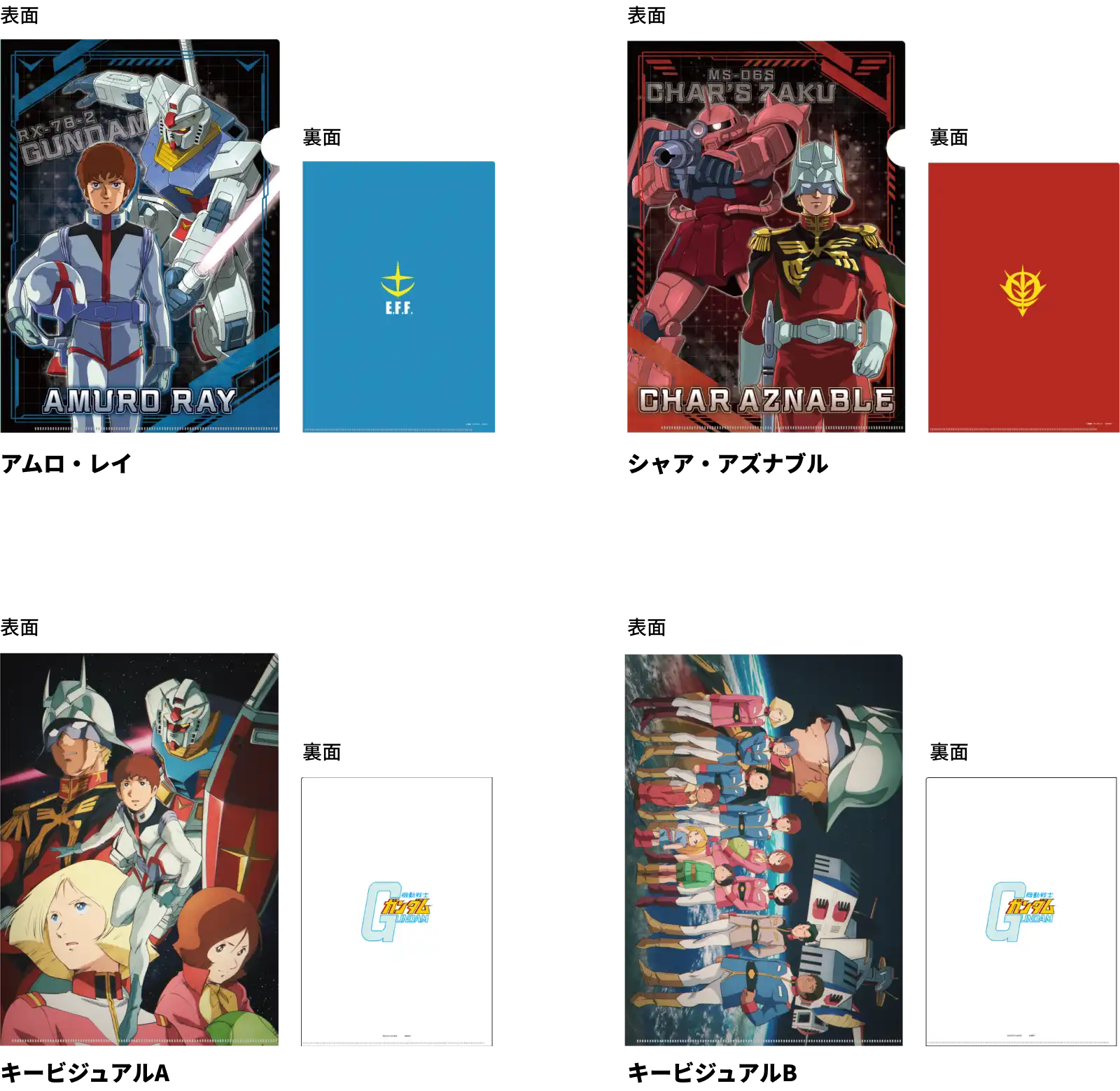 【本体サイズ】約W220×H310×D0.5mm【本体重量】約25g【材質】PP【パッケージ】ヘッダー付きPP袋【パッケージ入サイズ】約W222×H345×D0.7mm【パッケージ入重量】約30g【生産国】日本【JANコード】アムロ・レイ:4901770991009 シャア・アズナブル:4901770992617 キービジュアルA:4901770992754 キービジュアルB:4901770992778