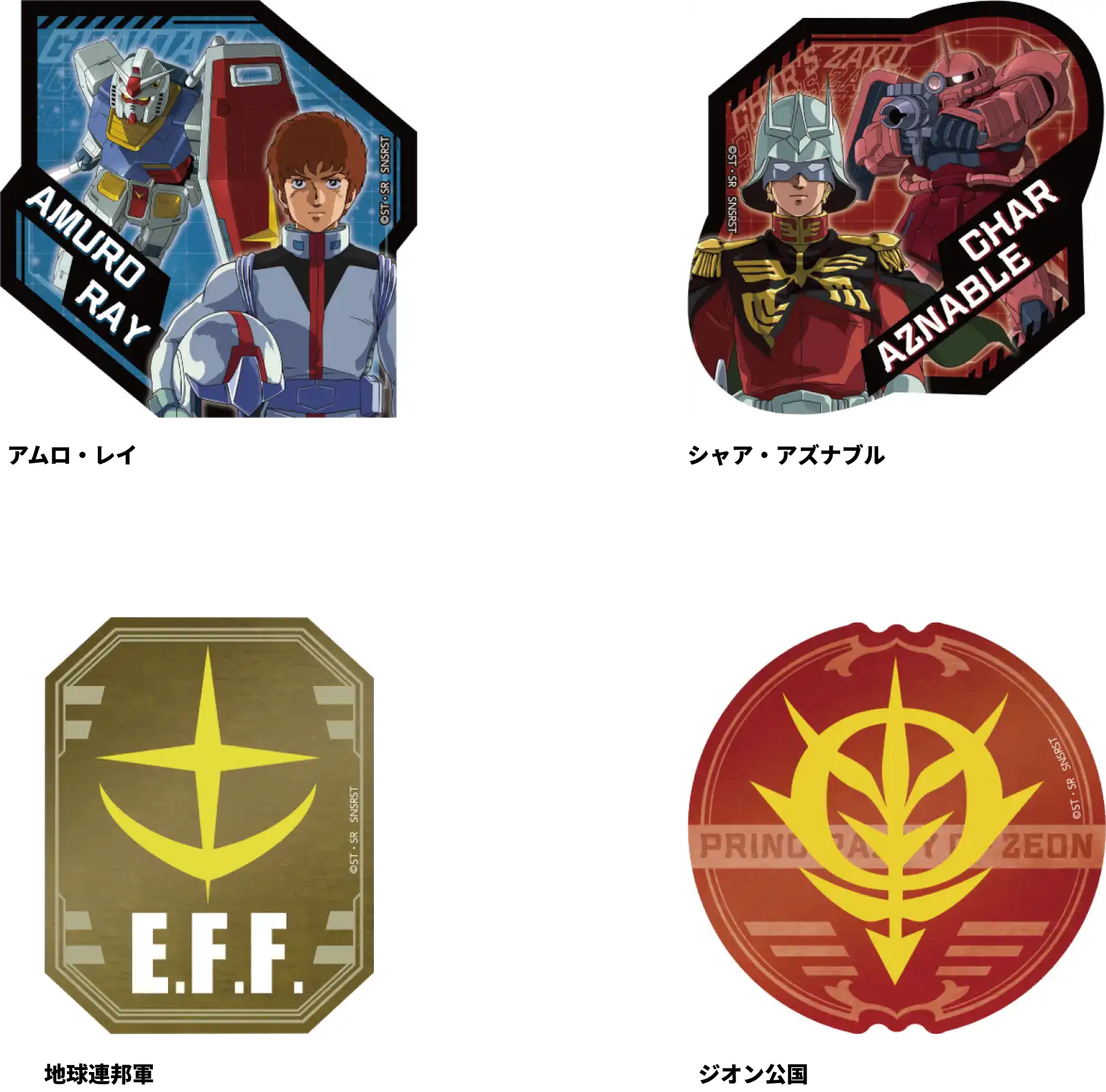 【本体サイズ】約W95×H95mm以内【本体重量】約1g【材質】合成紙・PP【パッケージ】台紙付PP袋【パッケージ入サイズ】約W105×H100×D0.1mm【パッケージ入重量】約5g【生産国】日本【JANコード】アムロ・レイ:4901770995380 シャア・アズナブル:4901770995397 地球連邦軍:4901770995403 ジオン公国:4901770995410