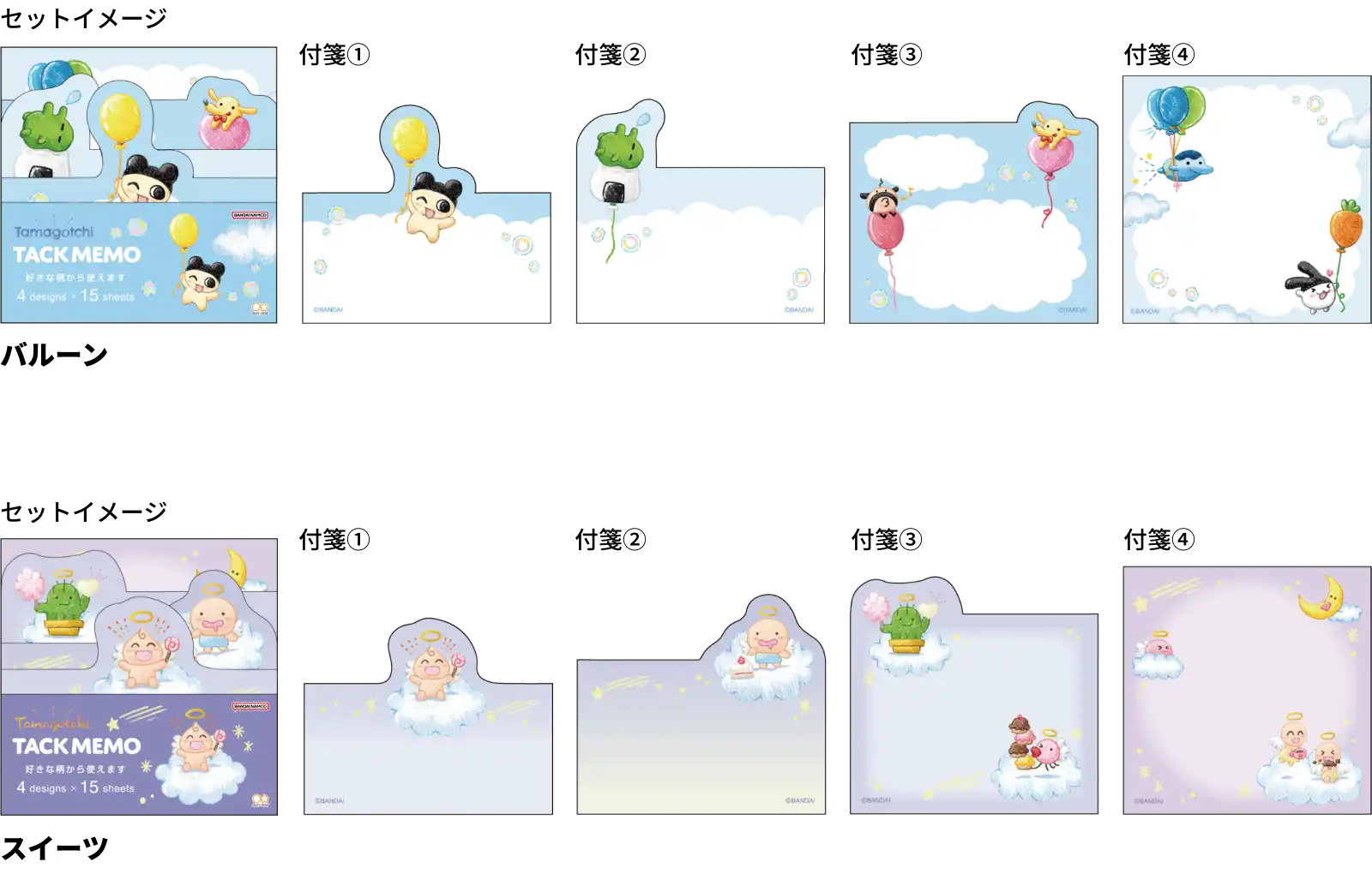 【本体サイズ】W69×H69×D7mm 【材質】紙 【内容】付箋 : 4柄 各15枚 計60枚 【パッケージ】ヘッダー袋【パッケージ入サイズ】W73×H100×D9mm 【パッケージ入重量】50g 【生産国】日本【JANコード】バルーン:4901770015392 スイーツ:4901770015460