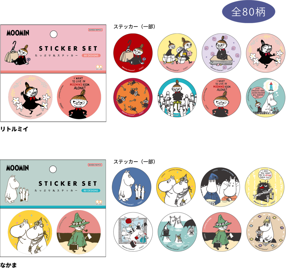 【本体サイズ】φ50mm 【材質】紙 【内容】80柄 各1枚 計80枚 【パッケージ】台紙付PP袋【パッケージ入サイズ】W120×H110×D12mm 【パッケージ入重量】約30g 【生産国】中国【JANコード】リトルミイ:4901770036540 なかま:4901770036557
