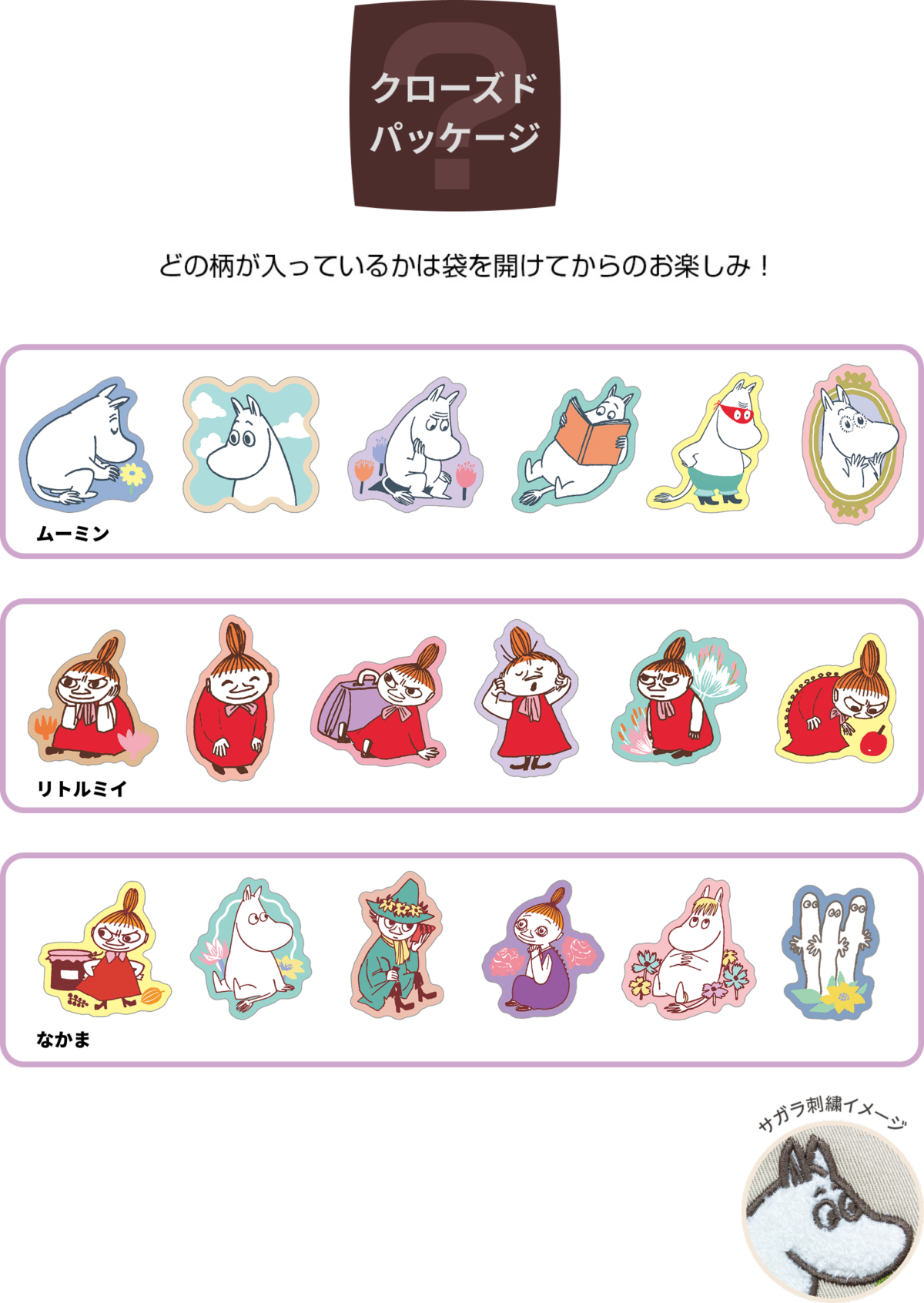 【本体サイズ】W50×H50×D15mm以内程度 【本体重量】約3g 【材質】ポリエステル・金属【パッケージ】紙封筒クローズドパッケージ【パッケージ入サイズ】約W85×H70×D16mm 【パッケージ入重量】約8g 【生産国】中国【JANコード】ムーミン:4901770036663 リトルミイ:4901770036670 なかま:4901770036687