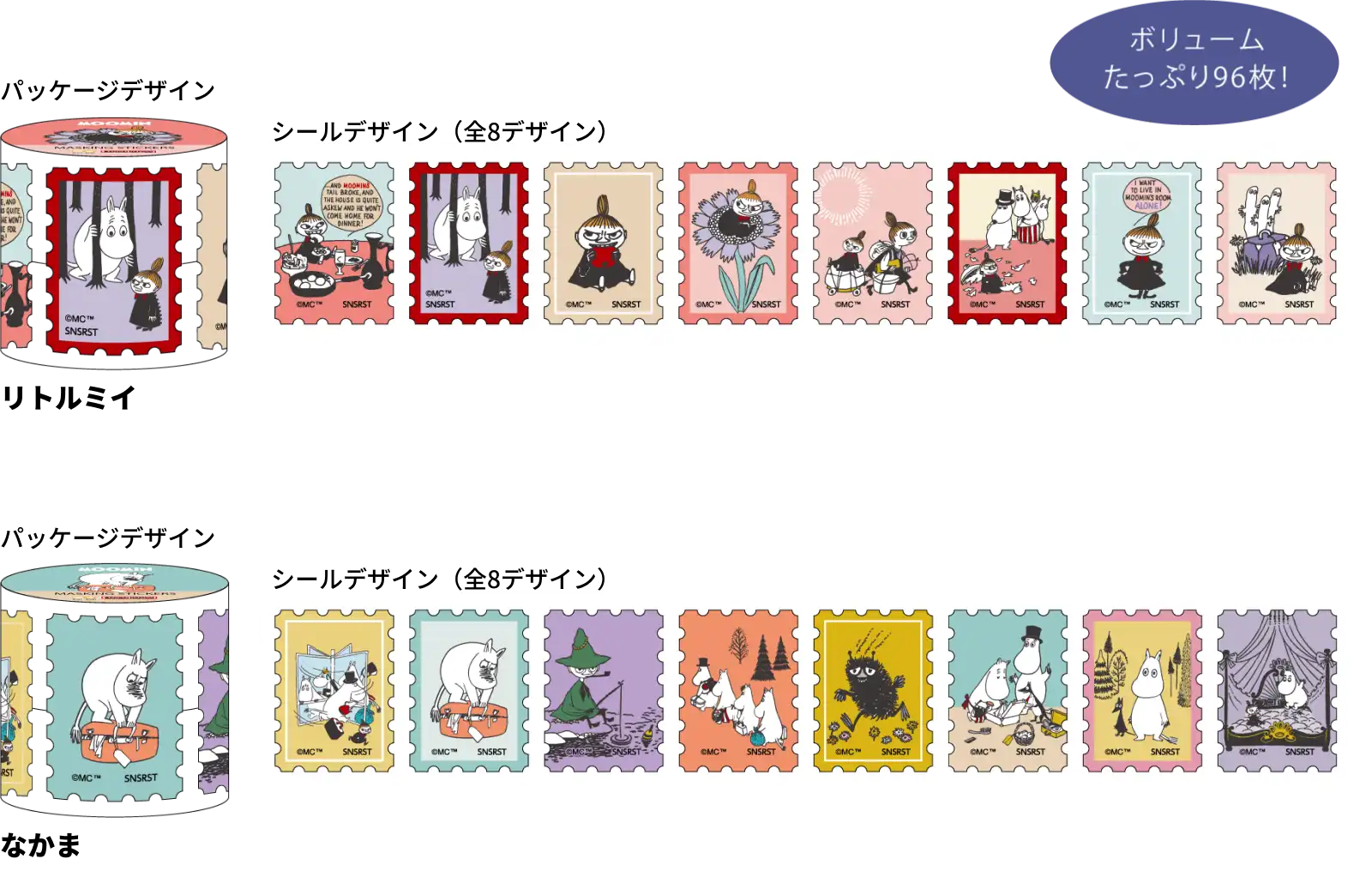 【シールサイズ】W22×H30mm 【材質】紙【内容】シール 8柄 各12枚 計96枚【パッケージ】PP巻き 【パッケージ入サイズ】W50×H35×D50mm【パッケージ入重量】17g 【生産国】中国【JANコード】リトルミイ:4901770036564 なかま:4901770036571