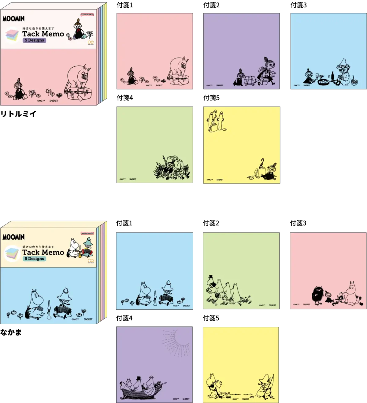 【本体サイズ】W75×H75×D11mm 【本体重量】約48g 【材質】紙 【内容】付箋:5柄 各20枚 計100枚【パッケージ】ヘッダー袋 【パッケージ入サイズ】W89×H115×D11mm 【生産国】日本【JANコード】リトルミイ:4901770036427 なかま:4901770036434