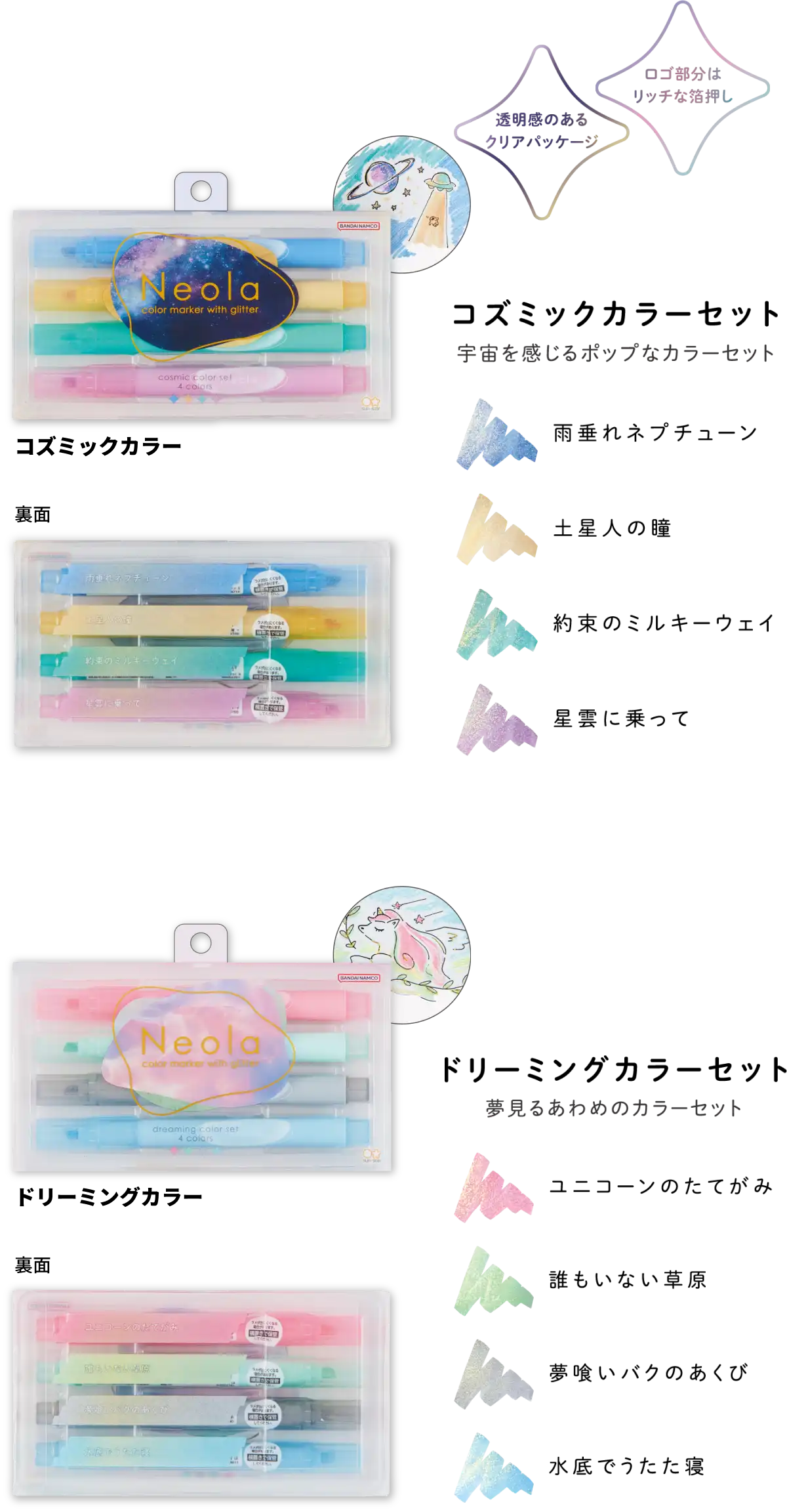 【本体サイズ】1本あたり 約W130×H11×D13mm 【本体重量】1本あたり 約8g【内容】4柄 各1本 【本体材質】PP 【インク】水性顔料【パッケージ】吊り下げ式PETケース 【パッケージ入サイズ】約W147×H81×D15mm【パッケージ入重量】約55g 【生産国】中国【JANコード】コズミックカラー:4901770036793 ドリーミングカラー:4901770036809