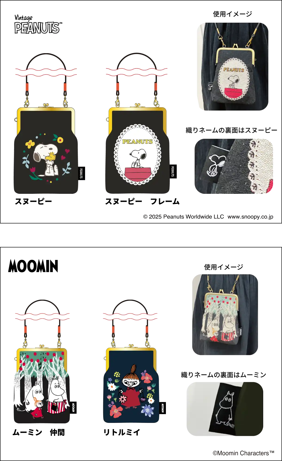 【本体サイズ】W140×H190×D27mm(ショルダー紐含まず) 紐:約105cm【本体重量】約95g【材質】綿・ポリエステル・スチール・PP【パッケージ】なし(タグ付)【生産国】中国【JANコード】スヌーピー:4901770039053 スヌーピー フレーム:4901770039060 ムーミン 仲間:4901770039121 リトルミイ:4901770039138