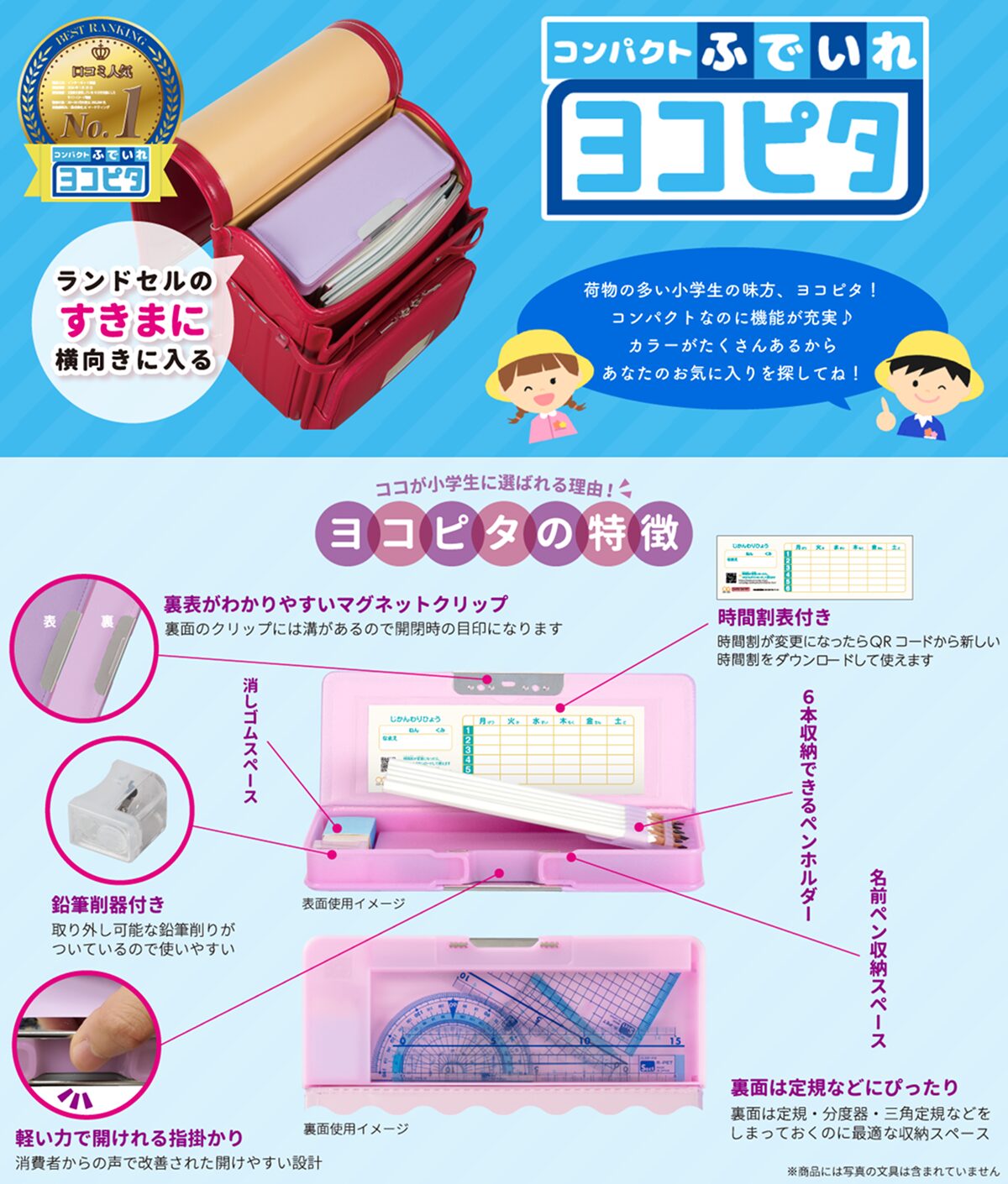 【本体サイズ】W89×H222×D27.2mm【本体重量】約178g【材質】本体:ABS・PU・PVC・PE・スチール / 削器:PS / 時間割表:紙【パッケージ】台紙付ヘッダー袋【パッケージ入サイズ】W128×H280×D30mm 【パッケージ入重量】約202g【生産国】中国【JANコード】クリア:4901770770796 クリアブルー:4901770770802 クリアバイオレット:4901770770819
