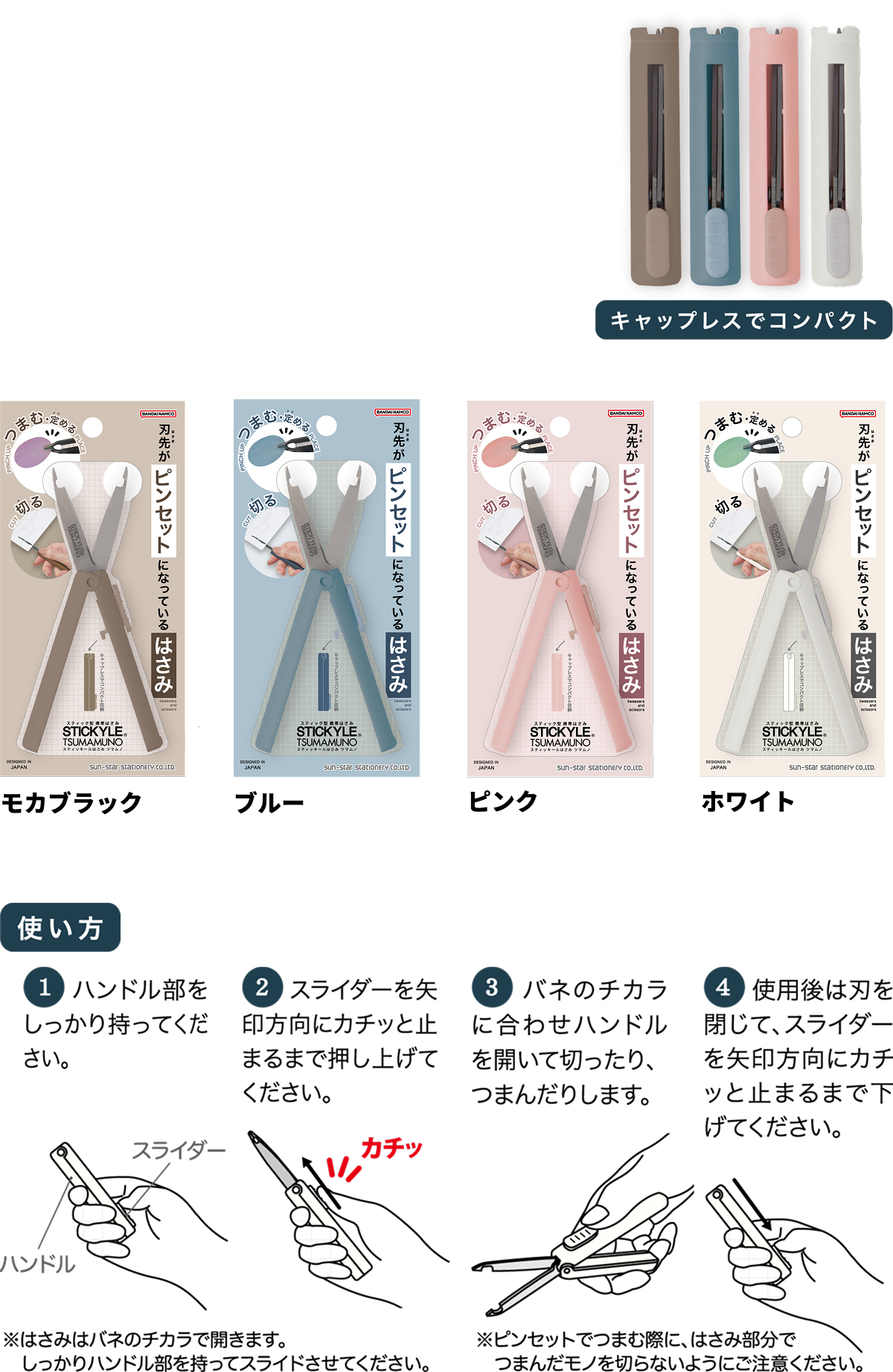 【本体サイズ】W15×H79×D17mm 【本体重量】18g【材質】ハンドル:ABS / スライドパーツ:POM / ブレード:ステンレス【刃渡り】35mm(ピンセット部分除く)【パッケージ】ヘッダー付挟み込みブリスター【パッケージ入サイズ】約W85×H165×D20mm 【パッケージ入重量】約30g 【生産国】中国【JANコード】モカブラック:4901770038551 ブルー:4901770038568 ピンク:4901770038575 ホワイト:4901770038582