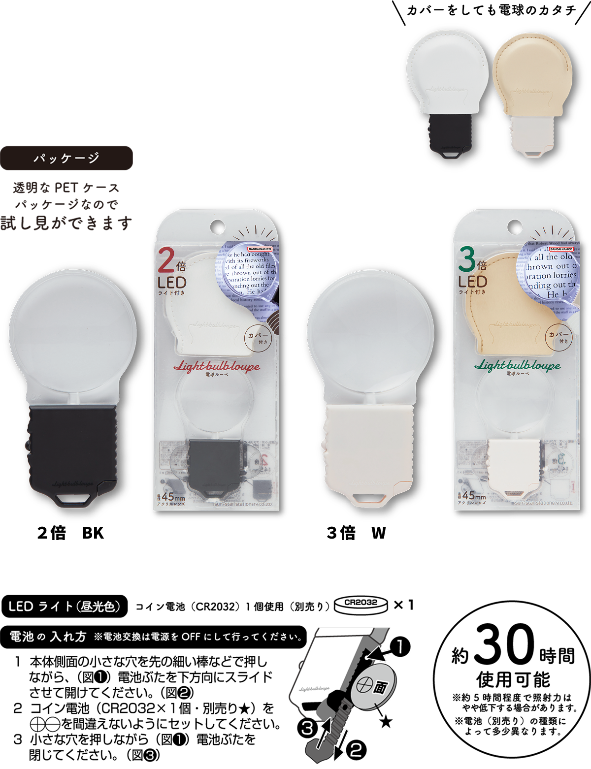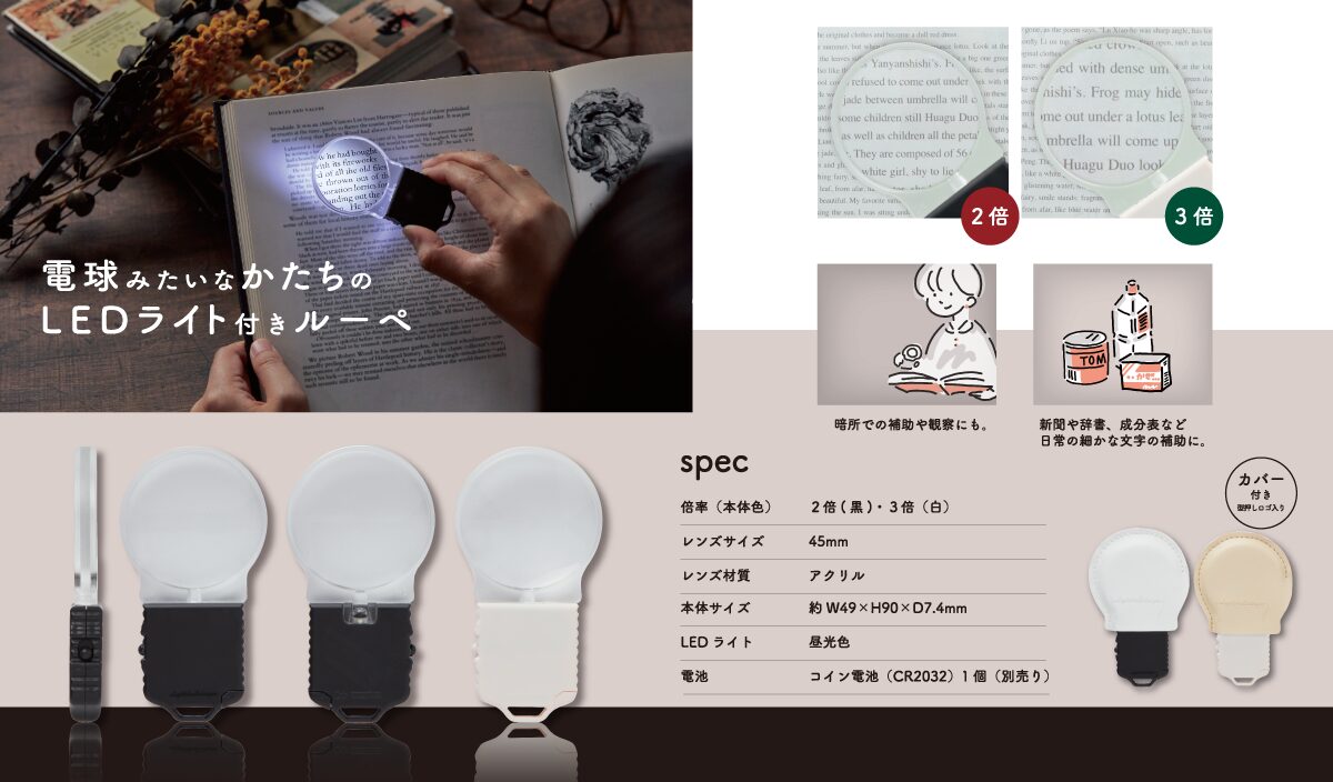 電球ルーペ 45mm ¥1,540-(消費税込) 【本体サイズ】約W49×H90×D7.4mm 【本体重量】24g 【材質】レンズ:アクリル/本体:ABS/カバー:PU【パッケージ】ヘッダー付きPETケース 【パッケージサイズ】約W82×H200×D15mm 【パッケージ入重量】約55g【生産国】中国【JANコード】2倍 BK:4901770033983 3倍 W:4901770033990