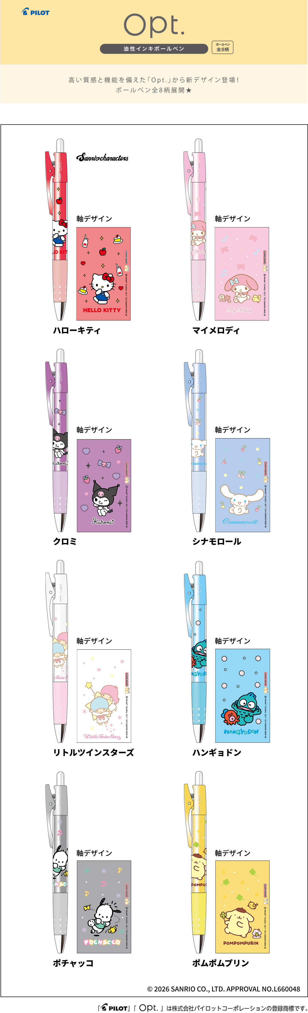 【本体サイズ】φ12.2×H148mm 【本体重量】16g 【材質】PC・金属【ボール径】0.7mm 【ボールインク】油性ブラック 【パッケージ】なし 【生産国】日本【JANコード】ハローキティ:4901770037301 マイメロディ:4901770037318 クロミ:4901770037325 シナモロール:4901770037332 リトルツインスターズ:4901770037349 ハンギョドン:4901770037356 ポチャッコ:4901770037363 ポムポムプリン:4901770037370