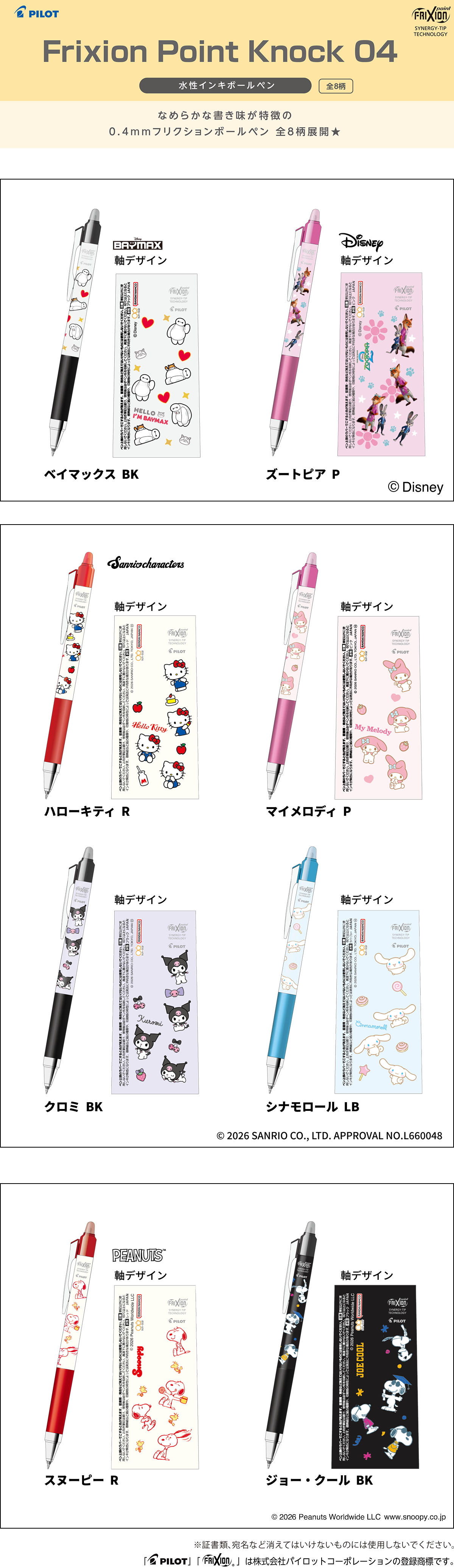 【本体サイズ】Φ10.5×H142mm 【本体重量】12g 【ボール径】0.4mm【インク色】水性ブラック、水性ピンク、水性レッド 、水性ライトブルー【替芯】BK→LFRF-143-B P→LFRF-14-P R→LFRF-143-R LB→LFRF-14-LB 【材質】本体軸:PC・ラバー 【パッケージ】なし 【生産国】日本【JANコード】ベイマックス BK:4901770037387 ズートピア P:4901770037394 ハローキティ R:4901770037400 マイメロディ P:4901770037417 クロミ BK:4901770037424 シナモロール LB:4901770037431 スヌーピー R:4901770037448 ジョー・クール BK:4901770037455