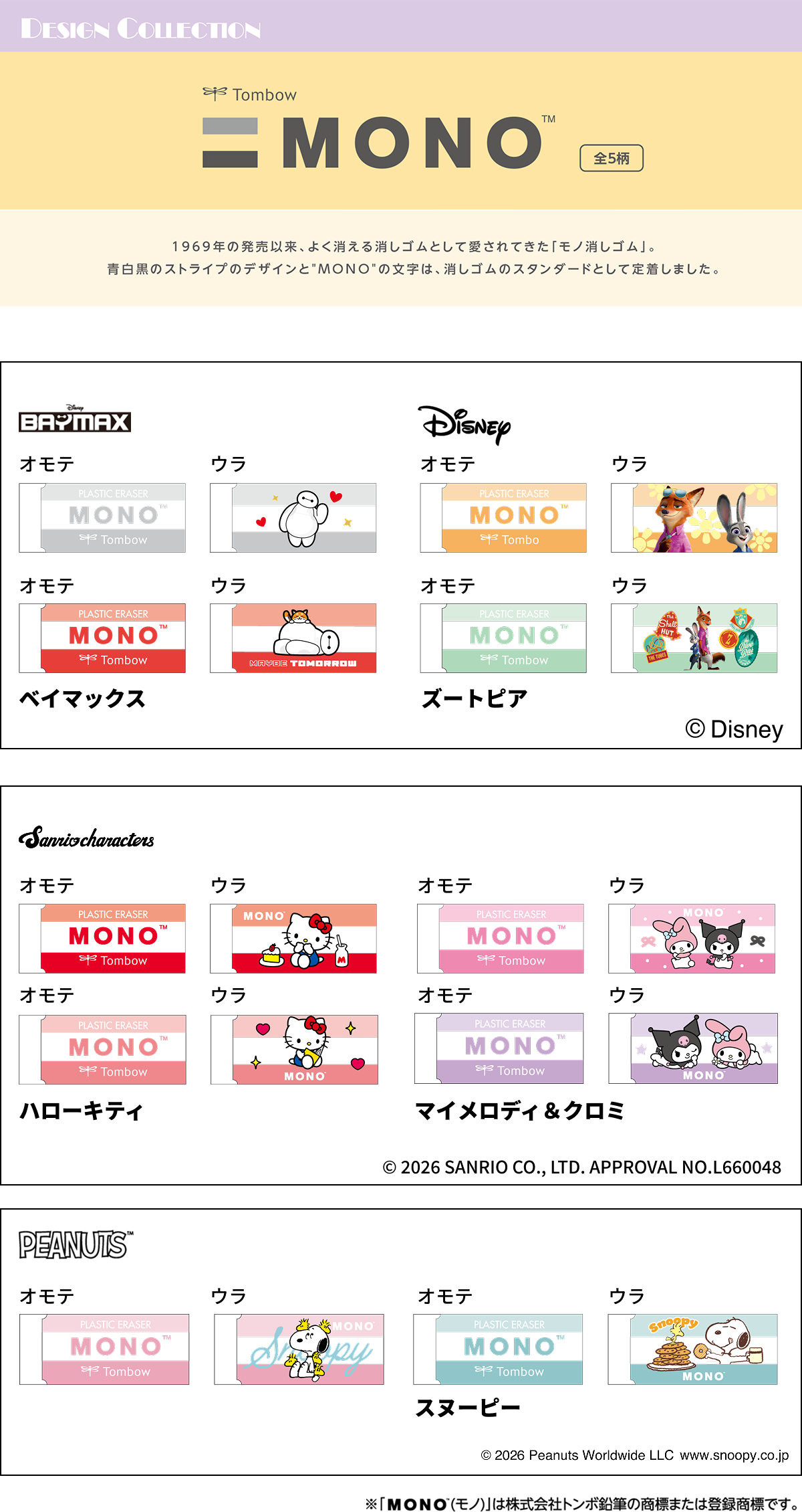 【本体サイズ】W55×H23×D11mm 【本体重量】19g 【材質】PVC・紙 【パッケージ】PP個装 【生産国】日本【JANコード】ベイマックス:4901770037462 ズートピア:4901770037479 ハローキティ:4901770037486 マイメロディ&クロミ:4901770037493 スヌーピー:4901770037509